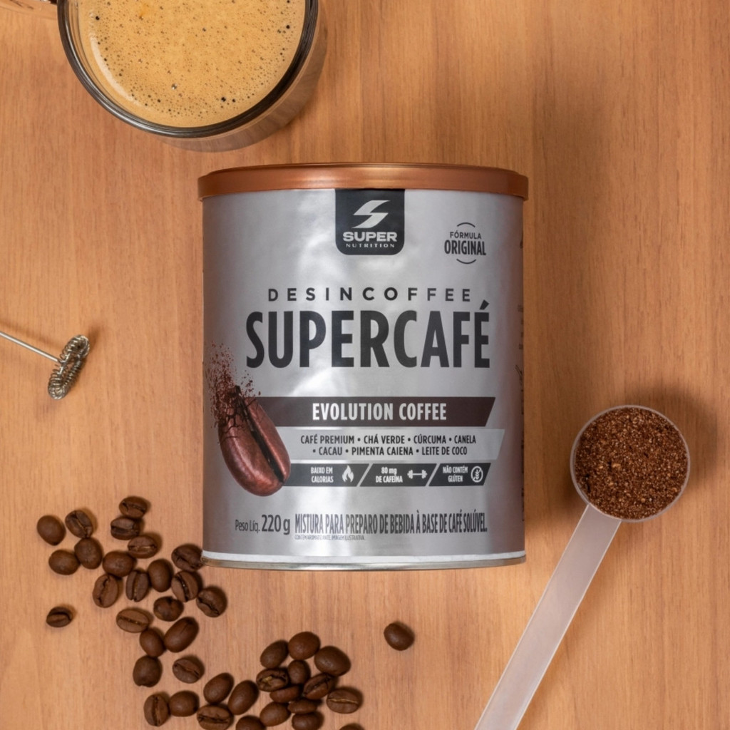SuperCafé Evolution Coffee Pote com 220g Super Nutrition Sobre o produto: O SuperCafé Evolution Coffee da Super Nutrition é uma bebida funcional e moderna, desenvolvida para entregar energia, foco e performance por meio de uma fórmula exclusiva à base de café premium. Ele combina ingredientes naturais como chá verde, cúrcuma, cacau, canela, pimenta caiena e leite de coco liofilizado, criando um blend poderoso e saboroso, ideal para quem busca otimizar o desempenho físico e mental ao longo do dia.Cada porção contém 80mg de cafeína, aliada a compostos antioxidantes e termogênicos que atuam em sinergia para melhorar a concentração, o estado de alerta e a disposição. É um verdadeiro upgrade no conceito de café funcional — mais leve, potente e sem adição de açúcares. Como consumir - Dissolva 1 scoop (10g) de SuperCafé Evolution em 100ml de água quente. - Misture bem até completa dissolução. - Recomendação: consumir até 2 porções por dia, preferencialmente em jejum pela manhã ou em momentos que exigem energia extra. Benefícios - 80mg de cafeína por porção: mais foco e energia mental - Com chá verde e pimenta caiena: ação termogênica e antioxidante - Leite de coco liofilizado: cremosidade e sabor sem lactose - Cacau e canela: sabor intenso e potencial anti-inflamatório - Cúrcuma: ação antioxidante e suporte ao sistema imunológico - Adoçado com stévia, xilitol, maltitol e taumatina: sem adição de açúcar - Baixo teor calórico e alta praticidade - Ideal para o dia a dia corrido e multitarefas - Pode ser usado como pré-treino, estimulante mental ou substituto do café tradicional Alergênicos: Pode conter derivados de amendoim, avelã, castanha de caju, castanha-do-pará, leite e soja.Não contém glúten. Ingredientes: Café solúvel, leite de coco liofilizado, cacau em pó, canela em pó, chá verde desidratado (Camellia sinensis), cúrcuma, pimenta caiena, edulcorantes (maltitol, xilitol, glicosídeo de esteviol e taumatina), aromatizantes naturais e emulsificante lecitina de girassol. Advertências - Este produto não é um medicamento. - Manter fora do alcance de crianças. - Conservar em local fresco, seco e ao abrigo da luz. - Consumir em até 40 dias após aberta a embalagem. - Pessoas com condições clínicas, gestantes ou lactantes devem consultar um profissional de saúde antes de consumir. - Não exceder a dose diária recomendada. Conclusão: O SuperCafé Evolution Coffee é uma inovação no universo dos cafés funcionais, oferecendo praticidade, saúde e sabor em cada dose. Perfeito para quem deseja manter o foco, energia e performance com um produto versátil, natural e sem adição de açúcares. Seu café evoluiu — agora ele te acompanha em todos os momentos do dia.