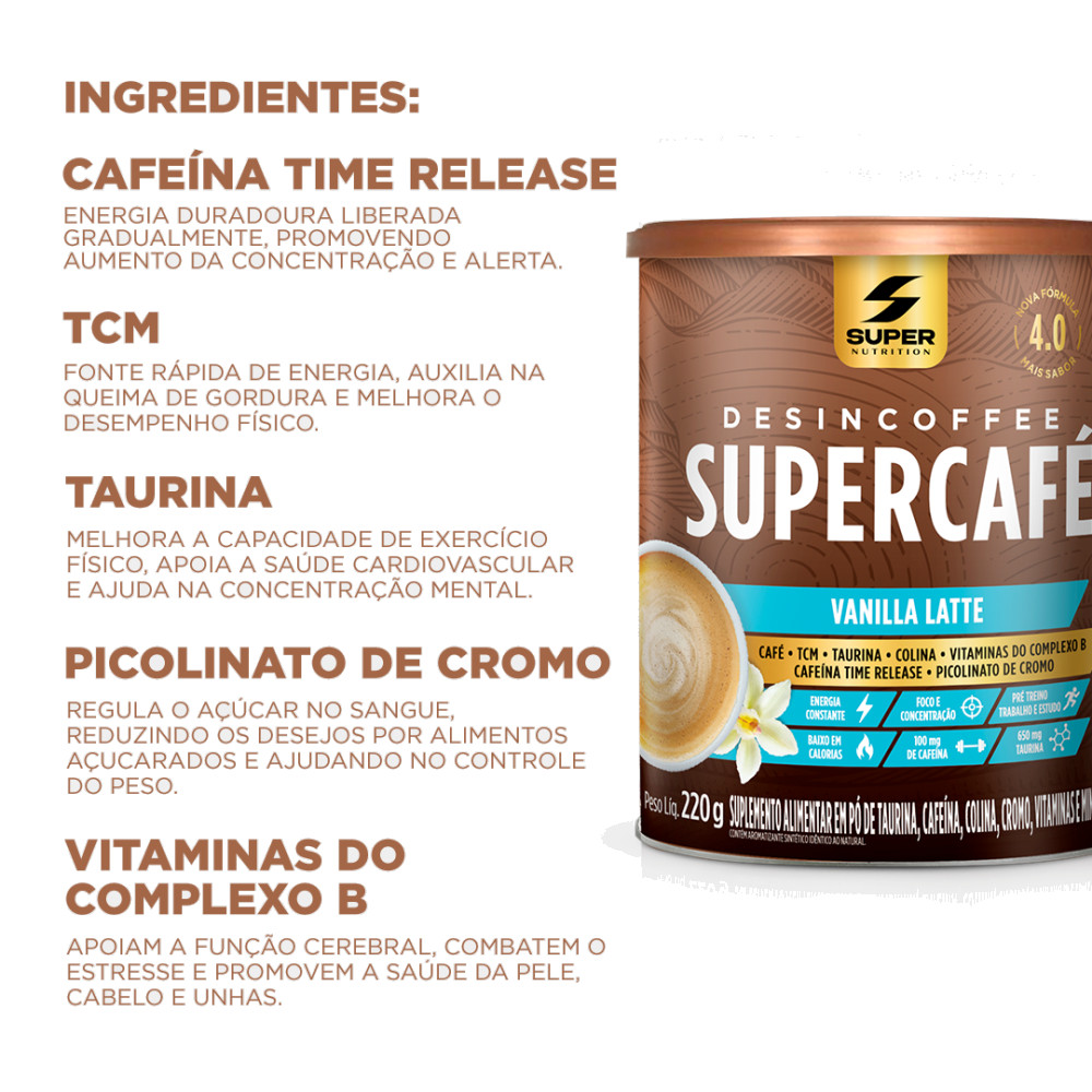 SUPERCAFÉ COM INGREDIENTES PREMIUM E FÓRMULA 4.0 MAIS SABOR E MELHOR PERFORMANCE CAFÉ • TCM • TAURINA • SEM AÇÚCAR • ADOÇADO COM STÉVIA • CAFEÍNA TIME RELEASE • COLINA • MINERAIS • PICOLINATO DE CROMO • VITAMINAS DO COMPLEXO B Café, ingredientes premium e muito sabor de Vanilla Latte O novo Supercafé de Desincoffee é uma bebida revolucionária à base de café e conta com ingredientes incríveis, totalmente diferente de tudo que você já provou. Combina ingredientes premium em uma formulação exclusiva. Possui 100mg de cafeína por porção, além de 650mg de Taurina que auxilia no aumento do estado de alerta e na melhora da concentração. Permite fazer o que te move, e ir além. Tudo isso com muito, muito sabor e baixas calorias. Como você nunca viu em um café bulletproof. Experimente o café com Vanilla Latte que vai despertar o melhor de suas várias versões. MODO DE PREPARO: Dissolva 1 scoop (10g) em água quente (100 a 200 mL);Misture bem, e está pronto para consumir! RECOMENDAÇÃO DE USO: Consumir 1 dose ao dia ou conforme orientação do médico ou nutricionista. PERGUNTAS FREQUENTES Quando devo consumir o produto? Consumir até 2 vezes ao dia, ou conforme orientação profissional. O produto quebra jejum?Sim, embora o produto seja baixo em calorias, há um aporte nutricional que interfere no jejum. Contudo, é uma forma interessante de quebrar jejum devido aos benefícios de seus ingredientes, sem intervir em pico insulínico. Quais as contra indicações? Produto contra indicado para gestantes, lactantes e crianças. Pode ser consumido com café? Recomendamos o consumo apenas de acordo com o modo de preparo, para garantir o sabor e funcionalidade desejada. Posso misturar com leite? Recomendamos consumi-lo apenas com a diluição em água. Posso consumir todos os dias? Ou devo realizar pausas?O produto é um suplemento alimentar e não tem nenhuma relação com medicamentos, não é necessário realizar pausas no consumo, podendo ser de uso diário e contínuo para manutenção da saúde. Tenho sensibilidade com pré-treinos comuns. Posso usar mesmo assim?Recomendamos que converse com seu médico ou nutricionista. Possuo histórico de problemas cardíacos e/ou coronários. Devo tomar?Neste caso, devido as propriedades estimulantes do produto não recomendamos o uso. Pode ser usado como pré-treino?Sim, por conter suplementos voltados para aumento de resistência física, energia e foco, pode ser usado como pré-treino. Recomendamos no mínimo 30 minutos antes da atividade física. Posso preparar gelado?Sim, o produto solubiliza e mantém um ótimo sabor mesmo em água fria. O produto é vegano? É sem lactose?Não. Alguns ingredientes podem conter traços de leite. Tem diferença entre o DESINCOFFEE para o SUPERCAFÉ?Sim, o Supercafé traz a proposta de unir a funcionalidade do Desincoffee aliada a explosão de sabor.