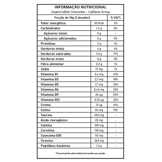 INFORMAÇÕES DE DESTAQUE Suplemento alimentar em pó; Sabor Choconilla; Fonte de vitaminas do complexo B; Sem açúcar adicionado; Não contém glúten. DESCRIÇÃO SuperCoffee é um suplemento alimentar em pó formulado com uma combinação de ingredientes como café solúvel, colágeno hidrolisado, triglicerídeos de cadeia média (TCM), vitaminas e minerais. Pode ser incluído na rotina como alternativa ao café tradicional, em diferentes momentos do dia. A combinação que une o aroma do chocolate com a textura do Vanilla Latte. Experimente 22 doses com ingredientes naturais e alta tecnologia que proporcionam a dose certa de energia limpa, disposição, foco e concentração. Produto sem adição de açúcares e sem glúten. COMPOSIÇÃO Triglicerídeos de cadeia média C8 + C10 (TCM), colágeno hidrolisado, cacau alcalino em pó, taurina, café arábica solúvel, L-tirosina, café verde moído, coenzima Q10, bitartarato de colina, cafeína microencapsulada, L-carnitina L-tartarato, especiarias, complexo de vitaminas B (tiamina mononitrato (vitamina B1), nicotinamida (vitamina B3), D-pantotenato de cálcio (vitamina B5), cloridrato de piridoxina (vitamina B6), ácido N-pteroil-L-glutâmico (vitamina B9), cianocobalamina (vitamina B12)), picolinato de cromo, aromatizantes, regulador de acidez bicarbonato de sódio e edulcorante glicosídeos de esteviol de Stevia rebaudiana Bertoni. ALÉRGICOS: CONTÉM DERIVADOS DE LEITE. PODE CONTER SOJA. NÃO CONTÉM GLÚTEN. MODO DE CONSUMO Consumir conforme orientação de profissional habilitado. Pode ser incluído em diferentes momentos do dia, de acordo com as preferências e objetivos alimentares individuais.