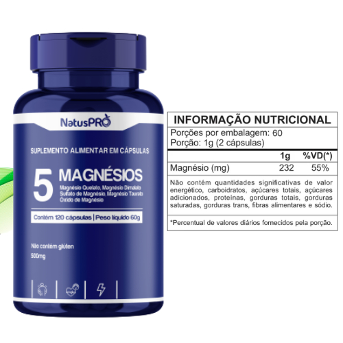 Suplemento 5 Magnésios 500mg 120 Cápsulas (Quelato + Dimalato + Citrato + Taurato + Óxido) - NatusPro