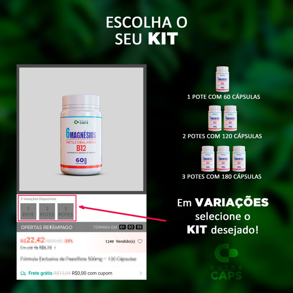 | Suplemento 6 Magnésios + B12 (metilcobalamina) Cápsulas 500mg este produto | R$ 28,90 | 19% | 5.0/5 | 6 |