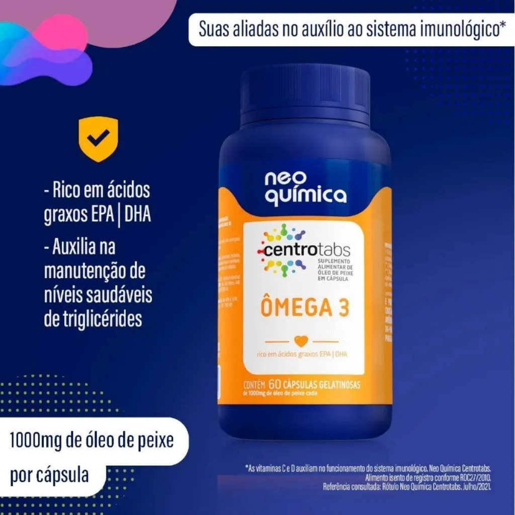 Suplemento Alimentar De Ômega 3 60Cáps - Neo Química O Ômega 3 Neo Química é um suplemento formulado com ácidos graxos essenciais que auxiliam na manutenção da saúde cardiovascular, cognitiva e no equilíbrio geral do organismo. Ideal para quem busca suporte diário para o bem-estar e uma rotina mais saudável. · Auxilia na manutenção da saúde do coração. · Contribui para o bom funcionamento do cérebro. · Possui ação anti-inflamatória natural. · Ajuda na redução de triglicerídeos, quando associado a hábitos saudáveis. · Suporte nutricional diário para quem busca qualidade de vida. Indicação de uso: recomendado para adultos que desejam manter níveis adequados de ácidos graxos essenciais na alimentação. Pode ser complementar para pessoas com dieta pobre em peixes ou que buscam suporte cardiovascular e cognitivo. Modo de uso: consumir conforme orientação da embalagem ou recomendação de um profissional de saúde. Imagens Meramente Ilustrativas. Todas as Informações Divulgadas são de Responsabilidade Exclusiva do Fabricante/fornecedor.