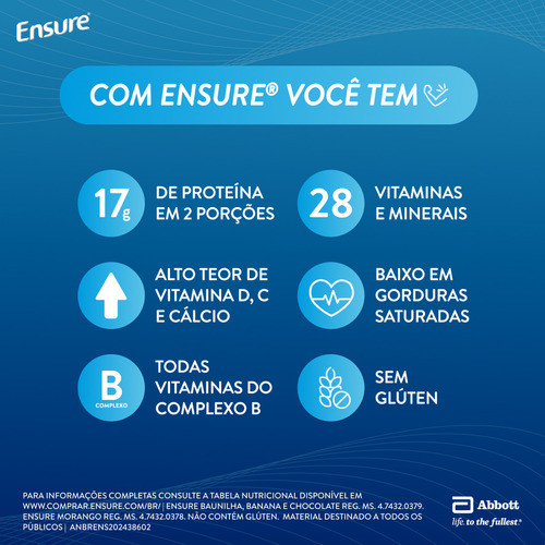 Descrição O Ensure Baunilha 850g é um suplemento nutricional completo e balanceado, desenvolvido pela Abbott Nutrition para adultos e idosos que precisam complementar a alimentação e manter força, energia e imunidade. Sua fórmula contém proteínas de alto valor biológico, 28 vitaminas e minerais, além de antioxidantes e gorduras saudáveis, que auxiliam na preservação da massa muscular, fortalecimento dos ossos e suporte imunológico. O sabor baunilha, leve e agradável, torna o consumo diário fácil e prazeroso, sendo ideal para pessoas com baixa ingestão alimentar, em recuperação de doenças ou com perda de apetite. Detalhes do Produto Apresentado em lata com 850g de pó sabor baunilha, o Ensure é um suplemento pronto para preparo com água, desenvolvido para oferecer nutrição completa em cada porção. Cada dose fornece proteínas, carboidratos e gorduras equilibradas, garantindo o aporte ideal de energia e nutrientes. É indicado para uso oral e pode ser consumido diariamente como refeição complementar ou substituto parcial. O produto é livre de glúten e pode ser utilizado tanto em casa quanto em ambiente hospitalar, sob recomendação médica. Diferenciais e Benefícios Contém 28 vitaminas e minerais, incluindo Cálcio, Ferro, Zinco, Vitaminas D, C, E e complexo B. Fonte de proteínas de alto valor biológico, que auxiliam na manutenção da massa muscular. Fortalece ossos e sistema imunológico. Promove energia e vitalidade no dia a dia. Indicado para adultos e idosos com alimentação insuficiente. Sabor baunilha, de fácil aceitação. Não contém glúten. Fabricado pela Abbott Nutrition, referência mundial em nutrição avançada. Perguntas Frequentes (FAQ) Para que serve o Ensure Baunilha? Serve para complementar a alimentação de adultos e idosos, ajudando a manter força, energia e nutrição adequada. Pode substituir refeições? Sim. Pode ser usado como lanche ou substituto parcial de uma refeição, conforme recomendação médica ou nutricional. Pode ser consumido todos os dias? Sim. O consumo diário é seguro e auxilia na manutenção da saúde e nutrição equilibrada. É indicado para quem tem diabetes? Existem versões específicas para diabéticos, como o Ensure Diabetes Care. Consulte o médico antes de usar este produto. Modo de Uso Dissolver 6 colheres-medida (aproximadamente 53g) em 195ml de água fria e misturar até completa dissolução. Pode ser consumido entre as refeições ou no café da manhã e jantar. Após preparado, manter sob refrigeração e consumir em até 24 horas. Composição Contém proteínas, carboidratos, gorduras boas, fibras e 28 vitaminas e minerais, incluindo Cálcio, Ferro, Zinco, Magnésio, Vitaminas D, C, E e B12. Não contém glúten. Resumo O que é? Suplemento nutricional completo para adultos e idosos. Quem deve usar? Pessoas com alimentação insuficiente, perda de apetite ou em recuperação. Quando usar? Diariamente, como reforço nutricional. Onde usar? Preparado com água, pronto para consumo. Por que usar? Para garantir força, energia, imunidade e equilíbrio nutricional. Como preparar? Misturar o pó em água e consumir 1 a 2 vezes ao dia conforme orientação profissional.