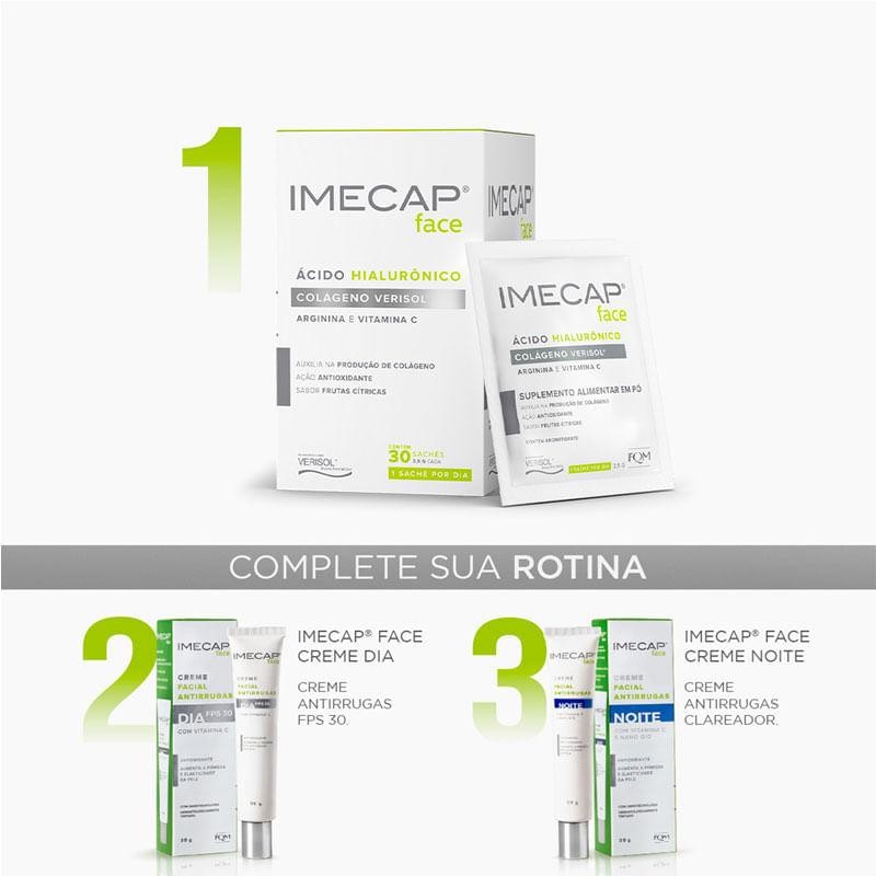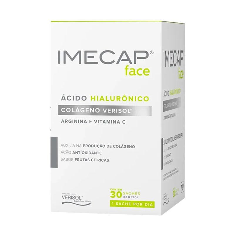 O que é e para que serve o suplemento Imecap Face 30 Sachês? O Imecap Face Sachês é um suplemento alimentar em pó, formulado com colágeno hidrolisado Verisol. Ele age de dentro para fora, possui ácido hialurônico para hidratação, e oferece ação antioxidante. Com sabor de frutas cítricas, não contém glúten, nem açúcar, e tem baixo valor energético, sendo ideal para o cuidado diário da pele do rosto. Benefícios e Diferenciais: - Suplemento alimentar em pó de colágeno hidrolisado Verisol® para pele. - Age de dentro para fora - Ação antioxidante. - Fórmula com colágeno Verisol®, tecnologia alemã desenvolvida especialmente para o cuidado com a pele. - Com ácido hialurônico, ajudando na hidratação da pele. - Sabor frutas cítricas. - Não contém glúten, nem açúcar. - Baixo valor energético. Principais ativos Ácido Hialurônico, Colágeno Verisol, Arginina e Vitaminas c. Como usar: Ingerir 1 (um) sachê por dia. Uso Adulto (≥ 19 anos). Modo de preparo: Adicionar o conteúdo do sachê (3,5 g) em 200 mL de água gelada ou quente. Advertências Este produto não é um medicamento. Não exceder a recomendação diária de consumo indicada na embalagem. Mantenha fora do alcance de crianças. Este produto não deve ser consumido por gestantes, lactantes e crianças. Proteger da luz, do calor e da umidade. O sachê deve ser consumido assim que aberto.