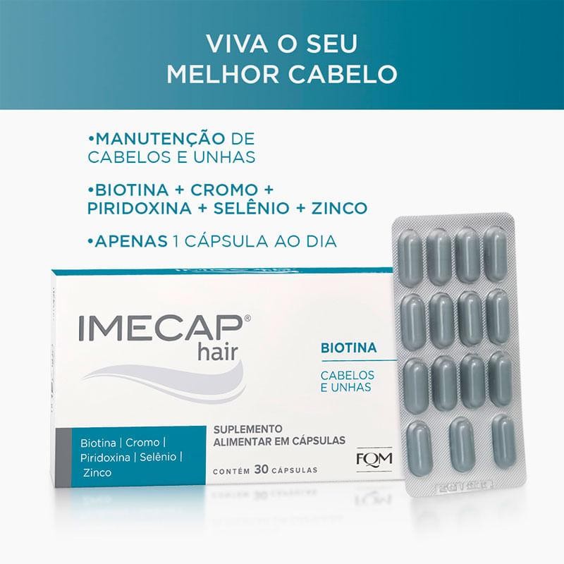 O que é e para que serve o suplemento Imecap Hair 30 Cápsulas? Imecap Hair Cápsulas é um suplemento alimentar formulado com nutrientes como Biotina, Cromo, Piridoxina, Selênio e Zinco. Imecap Hair Cápsulas é uma solução prática, com apenas 1 cápsula ao dia, sem glúten e zero calorias, ideal para manutenção dos cabelos e unhas. Benefícios e Diferenciais: - Suplemento alimentar em cápsulas para cabelos e unhas. - Manutenção de cabelos e unhas. - Com Biotina, Cromo, Piridoxina, Selênio e Zinco. - Apenas 1 cápsula ao dia. - Sem glúten. - Zero calorias. Principio ativo Cloridrato de piridoxina, Biotina, Cromo, Selênio e Zinco. Como usar? Ingerir 1 (uma) cápsula por dia, após refeição. Uso adulto (≥ 19 anos). Advertências Este produto não é um medicamento. Não exceder a recomendação diária de consumo indicada na embalagem. Mantenha fora do alcance de crianças. Conservar em temperatura ambiente (entre 15 °c e 30 °c). Proteger da luz e umidade.