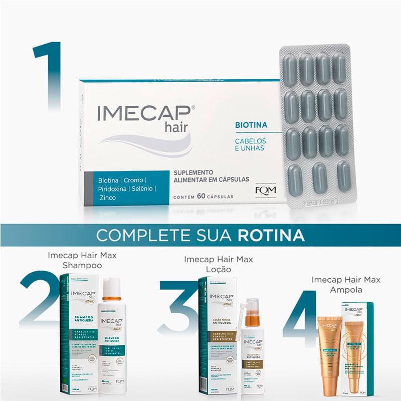 O que é e para que serve o suplemento Imecap Hair 30 Cápsulas? Imecap Hair Cápsulas é um suplemento alimentar formulado com nutrientes como Biotina, Cromo, Piridoxina, Selênio e Zinco. Imecap Hair Cápsulas é uma solução prática, com apenas 1 cápsula ao dia, sem glúten e zero calorias, ideal para manutenção dos cabelos e unhas. Benefícios e Diferenciais: - Suplemento alimentar em cápsulas para cabelos e unhas. - Manutenção de cabelos e unhas. - Com Biotina, Cromo, Piridoxina, Selênio e Zinco. - Apenas 1 cápsula ao dia. - Sem glúten. - Zero calorias. Principio ativo Cloridrato de piridoxina, Biotina, Cromo, Selênio e Zinco. Como usar? Ingerir 1 (uma) cápsula por dia, após refeição. Uso adulto (≥ 19 anos). Advertências Este produto não é um medicamento. Não exceder a recomendação diária de consumo indicada na embalagem. Mantenha fora do alcance de crianças. Conservar em temperatura ambiente (entre 15 °c e 30 °c). Proteger da luz e umidade.