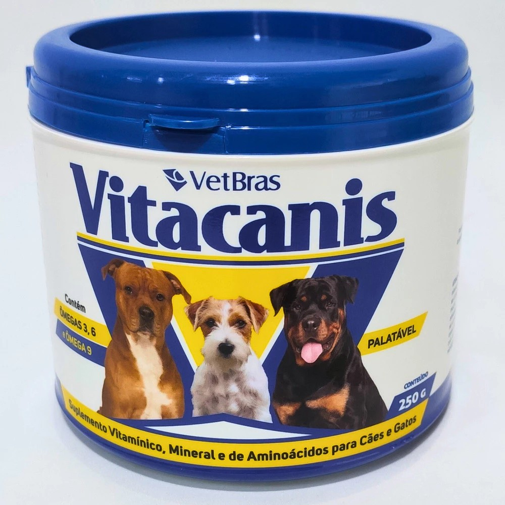 O VITACANIS é um suplemento vitamínico, mineral e de aminoácidos indicado para cães e gatos nas épocas de aleitamento das fêmeas, amamentação dos filhotes, crescimento, gestação, reprodução e geriatria dos animais, em todos os casos em que seja necessária a suplementação de vitaminas, minerais e aminoácidos presentes. Com ômegas 3, 6 e 9. MODO DE USAR: Administrar o produto diariamente, puro ou misturado ao alimento, nas seguintes dosagens: CÃES PARA CÃES JOVENS, EM CRESCIMENTO E DE COMPANHIA: 1 g para cada kg de peso corpóreo; PARA CADELAS EM GESTAÇÃO, LACTAÇÃO E MACHOS REPRODUTORES: 1,5 g para cada kg de peso corpóreo. Quantidade: Pote com 250 g Pacote inclui: 1x pote com 250 g do produto Vitacanis, laboratório VetBras