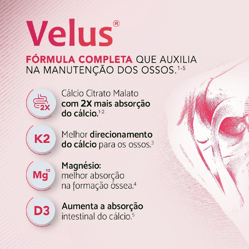 Velus é um suplemento alimentar em comprimidos revestidos, composto por cálcio, magnésio, vitamina K, e vitamina D. Zero caloria e açúcar.