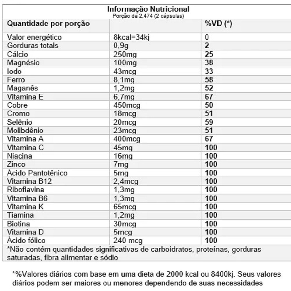 Todos nossos pedidos são enviados em no máximo 24hs após confirmação de pagamento. Polivitamínico AZ é um complexo vitamínico que vai complementar a alimentação quando esta não consegue suprir as necessidades nutricionais em relação aos minerais e vitaminas. Possui as vitaminas A, todo o complexo B, vitaminas C,D,E,K, cálcio, fósforo, ferro, magnésio, cobre, iodo, selênio e zinco, fazendo desta uma composição bem completa e eficiente. Qual a função das Vitaminas? Para várias funções, dentre elas agir como antioxidantes, ajudar o metabolismo dos carboidratos, proteínas e gorduras, evitar danos ao DNA, fortalecer os olhos, coração, cabelos e unhas, auxiliar na síntese da hemoglobina, evitar doenças neurodegenerativas e tumores. Qual a função dos minerais? Os minerais são importantes para a saúde dos ossos, agem também como antioxidantes, previnem o envelhecimento das células, ajudam no metabolismo da glicose, protegem órgãos como o coração e pulmão, e muitas outras funções essenciais para a saúde. O ideal é conseguir manter o corpo nutrido pela alimentação, mas muitas vezes a vida agitada nos rouba o direito até mesmo de um almoço tranquilo e regado a alimentos necessários para manter a nossa saúde. Posologia: Tomar 1 comprimido ao dia. Sem adição de açúcares. Ingerir com líquido. Não engorda. Registro o Ministério da Saúde: isento conforme RDC 27/10