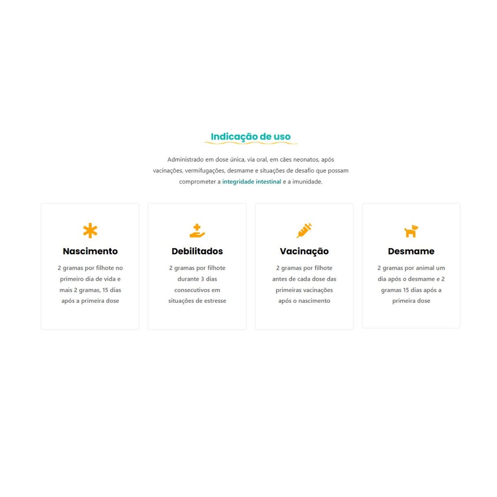 A MANADA ANIMAL é um marketplace de produtos veterinários. É a escolha certa para tutores que prezam pela qualidade dos produtos que seu animal necessita. Tudo com o suporte de uma equipe de veterinários e gestores com mais de 10 anos de experiência no mercado. Fique tranquilo, todos os nossos produtos são originais, adquiridos através de distribuidores credenciados! Ah, e todas as vendas acompanham nota fiscal! MANADA ANIMAL, Tranquilidade pra você, cuidado para ele! ___________________________________ NUXCELL NEO - BENEFÍCIOS - Auxilia na modulação do sistema imunológico e ajuda na manutenção da saúde intestinal. Regula as funções fisiológicas. Equilibra a microbiota intestinal e favorece absorção de nutrientes. - INDICAÇÃO - Indicado para suplementação específica de cães neonatos, debilitados (enterites e outras afecções) ou em situações de estresse (vacinações, desmame e outras). MODO DE USAR : Via Oral. Pronto Uso. ANIMAIS RECÉM NASCIDOS - 02 gramas no primeiro dia de vida e 02 gramas quinze dias após a 1a dose. ANIMAIS DEBILITADOS - 02 gramas por animal / dia durante 3 dias consecutivos. VACINAÇÕES - 02 gramas por animal antes de cada dose. DESMAME - 02 gramas por animal um dia após o desmame e mais 2 dias após desmame e mais 02 gramas quinze dias depois. COMPOSIÇÃO: Vitamina D3, vitamina B6, vitamina B1, Lactobacillus casei (CCT 1465), Saccharomyces cerevisiae (ATCC 18824), ácido fólico, ácido pantotênico, ácido nicotínico, arginina, aroma de banana, BHT (hidróxido de tolueno butilado), cloreto de colina pó - 60%, Complexo manganês aminoácido, complexo cobre aminoácido, Aditivo prébiotico, cloreto de potássio, corante artificial vermelho Ponceau 4R, complexo selênio aminoácido, complexo zinco aminoácido, complexo ferro aminoácido, fenilalanina, iodato de cálcio, vitamina B2, histidina, inositol, vitamina B12, nucleotídeos e Vitamina A.