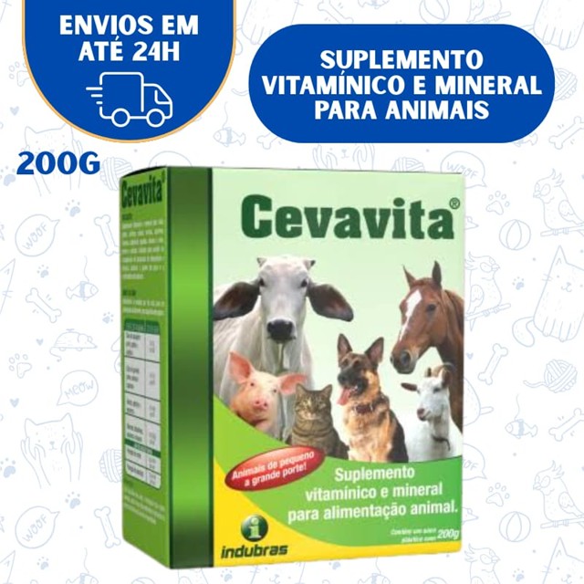 🐄 Cevavita – Suplemento Vitamínico e Mineral 200g Suplemento nutricional para animais | Saúde e desempenho Cevavita é um suplemento vitamínico e mineral indicado para animais de pequeno a grande porte, que oferece suporte completo à alimentação, auxiliando no crescimento, imunidade e vigor. Ideal para cães, gatos, bovinos, equinos, suínos, caprinos e ovinos. -- *Características e Benefícios: - Fonte completa de vitaminas e minerais - Auxilia no crescimento e desenvolvimento saudável - Fortalece o sistema imunológico - Indicado para todas as fases da vida - Pode ser administrado junto à ração -- * Indicação: Alimentação suplementar de animais em crescimento, lactantes, idosos, ou em recuperação de enfermidades. -- *Modo de uso: Misturar à ração ou alimento do animal, seguindo a dosagem recomendada por um médico veterinário, conforme a espécie e o porte do animal. 📦 Conteúdo: Embalagem com 200g 🏭 Fabricante: Indubras Indústria Veterinária S/A