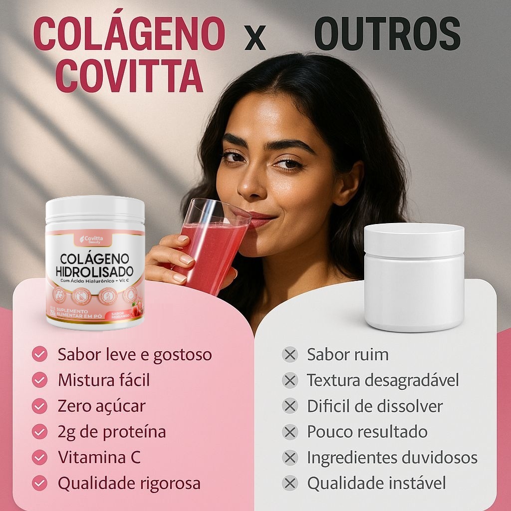 Suplemento Colágeno Hidrolisado + Ácido Hialurônico – Covitta Beauty Nutrição completa para pele, cabelos e unhas, de dentro para fora. Com colágeno de alta qualidade e ácido hialurônico, este suplemento auxilia na manutenção da saúde da pele, contribuindo para firmeza e elasticidade. Também ajuda no crescimento dos cabelos e na resistência das unhas**, ideal para quem busca uma rotina de beleza mais completa e prática. ✨ Benefícios do produto • Auxilia na manutenção da firmeza e elasticidade da pele** • Contribui para cabelos com mais brilho e vitalidade** • Auxilia na resistência das unhas** • Fonte de aminoácidos essenciais • Com Ácido Hialurônico • Rápida dissolução e sabor agradável 👤 Para quem é indicado • Quem busca uma beleza mais saudável no dia a dia • Quem deseja cuidar da pele, cabelos e unhas com mais praticidade • Quem quer incluir colágeno na rotina de autocuidado 📌 Modo de uso Consumir 1 porção ao dia, conforme orientação de fabricante. Dissolver em água ou bebida de preferência. 📦 Conteúdo 250g – Suplemento alimentar em pó. 🔒 Qualidade e Confiança Fabricado seguindo boas práticas de fabricação. Produto original Covitta Beauty. 🚚 Envio imediato em até 24hs.