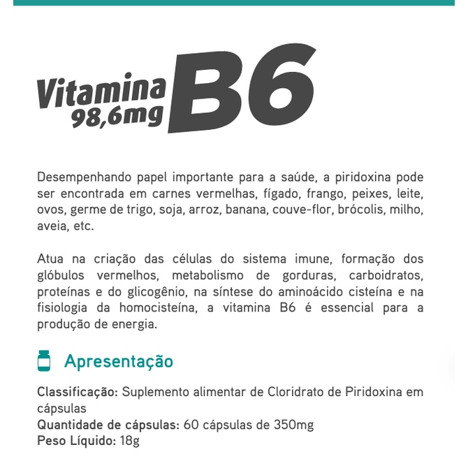 Experimente a Vitamina B6 Apisnutri e aproveite todos os benefícios que essa poderosa vitamina pode oferecer! Cada cápsula de Vitamina B6 Apisnutri contém 98,6mg de piridoxina, o que corresponde a 277% da Ingestão Diária Recomendada (IDR). Com essa dosagem concentrada, você garante um aporte significativo dessa vitamina essencial para o seu organismo. A vitamina B6 desempenha diversas funções importantes no funcionamento do corpo, e é essencial para manter a saúde em dia. Ela auxilia na formação das células vermelhas do sangue, favorece o bom funcionamento do sistema imunológico e é fundamental para o metabolismo energético. Além disso, a vitamina B6 também desempenha um papel importante no metabolismo de proteínas e glicogênio, contribuindo para o equilíbrio do organismo. Cada frasco de Vitamina B6 Apisnutri contém 60 cápsulas, totalizando 280 mg de produto. É prático e conveniente, permitindo que você tenha uma fonte confiável de vitamina B6 sempre à mão. O modo de uso é simples: basta ingerir uma cápsula por dia para obter todos os benefícios dessa vitamina. A composição do produto inclui amido, vitamina B6 e a cápsula é feita de gelatina e água deionizada. Vale ressaltar que a Vitamina B6 Apisnutri não contém glúten, atendendo às necessidades de pessoas com restrições alimentares. É importante destacar que este produto não é um medicamento e não tem a finalidade de tratar, curar ou prevenir doenças. Além disso, é essencial respeitar a recomendação diária de consumo indicada na embalagem e, no caso de gestantes e lactantes, é fundamental seguir a orientação de um nutricionista ou médico. Invista em sua saúde com a Vitamina B6 Apisnutri e desfrute dos benefícios dessa vitamina essencial para o bom funcionamento do seu organismo. Garanta a sua hoje mesmo e sinta a diferença que uma suplementação de qualidade pode fazer em sua vida! *Lembre-se de sempre consultar um profissional de saúde antes de iniciar qualquer suplementação alimentar.