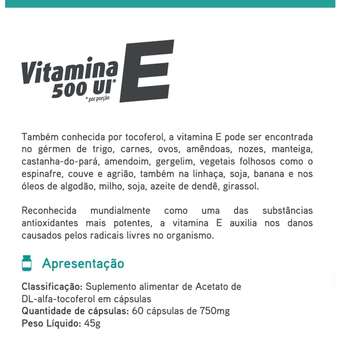 A Vitamina E Apisnutri é o suplemento alimentar ideal para você obter os benefícios antioxidantes e protetores que seu corpo precisa! Cada cápsula da Vitamina E contém 500mg de tocoferol, correspondendo a 5000% da Ingestão Diária Recomendada (IDR). A vitamina E desempenha um papel crucial no organismo, agindo como um potente agente antioxidante, combatendo os danos causados pelos radicais livres e proporcionando uma ação protetora essencial. A ação antioxidante da vitamina E é cientificamente reconhecida, auxiliando seu corpo a combater os efeitos negativos dos radicais livres, que podem causar danos celulares e acelerar o envelhecimento. Ao proteger suas células, a vitamina E contribui para uma saúde melhor e promove o bem-estar geral. O frasco da Vitamina E Apisnutri contém 60 cápsulas, cada uma com 750mg. O modo de uso é simples: basta tomar 2 cápsula por dia para obter todos os benefícios. A composição do produto inclui amido, vitamina E e cápsula de gelatina e água purificada. Além disso, a Vitamina E Apisnutri é livre de glúten, sendo adequada para pessoas com restrições alimentares. Lembramos que este produto não é um medicamento e não tem a finalidade de tratar, curar ou prevenir doenças. É importante respeitar a recomendação diária de consumo indicada na embalagem. Se você estiver gestante, lactante ou tiver qualquer dúvida, é recomendado consultar um nutricionista ou médico antes de consumir este produto. Invista na Vitamina E Apisnutri e proporcione ao seu corpo a proteção antioxidante necessária para uma vida saudável e vibrante! *Lembre-se de sempre consultar um profissional de saúde antes de iniciar qualquer suplementação alimentar.