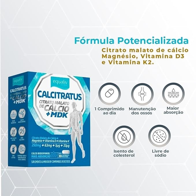 Suplemento Equaliv Calcitratus Citrato de Cálcio +MDK 30Cps_x000d_ _x000d_ Uma nutrição equilibrada tem um papel muito importante na qualidade de vida. Com o ritmo acelerado de muitas pessoas, às vezes, é muito difícil prestar atenção a todos os requisitos que o corpo precisa para estar saudável e forte. Neste sentido, os suplementos cumprem a função de complementar a alimentação e ajudam a obter as vitaminas, minerais, proteínas e outros componentes indispensáveis para o correto funcionamento do organismo._x000d_ _x000d_ _x000d_ Para uma dieta balanceada e uma atividade física de alta intensidade._x000d_ _x000d_ Contém magnésio, Vitamina D e K e vitaminas do complexo B em sua composição._x000d_ _x000d_ _x000d_ Apresenta cálcio associado com o sal carbonato, o que faz com que seja melhor absorvido e aproveitado pelo corpo. Ainda combinada com importantes ingredientes como a Vitamina D, Vitamina K2 e o Magnésio, que não só ajudam na adesão do cálcio, mas também a garantir adesão no local certo e evitando o seu depósito nas artérias._x000d_ _x000d_ Sem sabor._x000d_ _x000d_ Consumir 2 comprimidos ao dia, ou conforme orientação do médico e/ou nutricionista._x000d_ _x000d_ Não contém lactose, glúten e açúcares. _x000d_ Imagens Meramente Ilustrativas. Todas as Informações Divulgadas são de Responsabilidade Exclusiva do Fabricante/fornecedor.