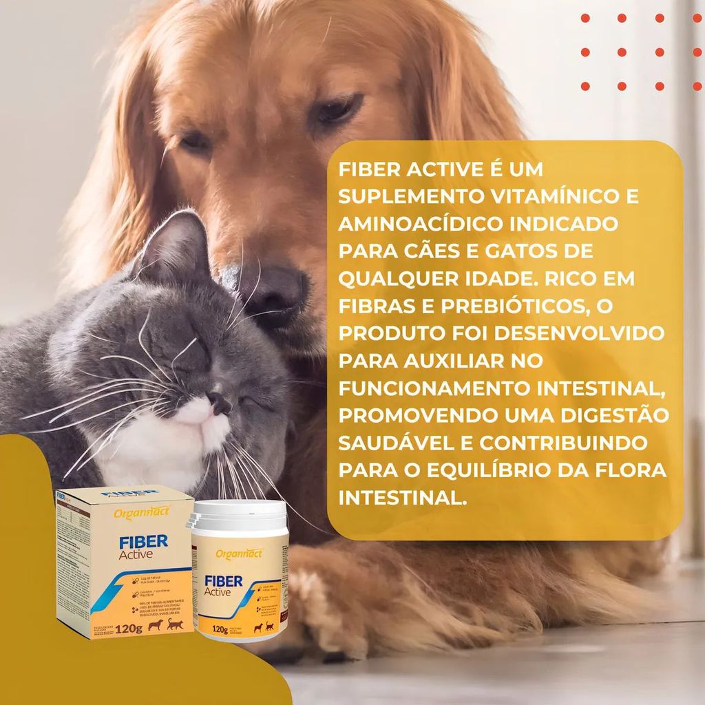 DESCRIÇÃO: Fiber Active é um suplemento vitamínico e aminoacídico indicado para cães e gatos de qualquer idade. Rico em fibras e prebióticos, o produto foi desenvolvido para auxiliar no funcionamento intestinal, promovendo uma digestão saudável e contribuindo para o equilíbrio da flora intestinal. BENEFÍCIOS Auxilia na manutenção de um sistema digestivo saudável graças ao seu conteúdo de fibras e prebióticos. Contribui para a absorção de nutrientes e o bem-estar geral do animal. Combina ingredientes naturais, como linhaça, psyllium, cúrcuma e óleo essencial de copaíba, que colaboram para uma nutrição de qualidade. Fornece suporte adicional com aminoácidos e outros componentes que promovem a saúde intestinal. MODO DE USAR Administrar por via oral: 2g (equivalente a uma colher dosadora) para cada 5kg de peso corporal. Dosagem sugerida: Animais de até 5kg: 2g (1 colher) Animais de 6kg a 10kg: 4g (2 colheres) Animais de 11kg a 15kg: 6g (3 colheres) Animais de 16kg a 20kg: 8g (4 colheres) Animais acima de 20kg: 10g (5 colheres) Pode ser fornecido puro ou misturado à ração, alimento úmido ou alimentação natural. A ingestão adequada de água deve ser mantida diariamente, associada à dieta equilibrada. CUIDADOS Seguir a orientação do médico-veterinário quanto à dosagem e frequência de administração. Manter o suplemento em local seco e protegido, conforme as recomendações de armazenamento. Observar a resposta do animal ao suplemento e ajustar a dieta se necessário. Garantir que a administração do produto esteja sempre associada a uma ingestão hídrica adequada e a uma alimentação balanceada.