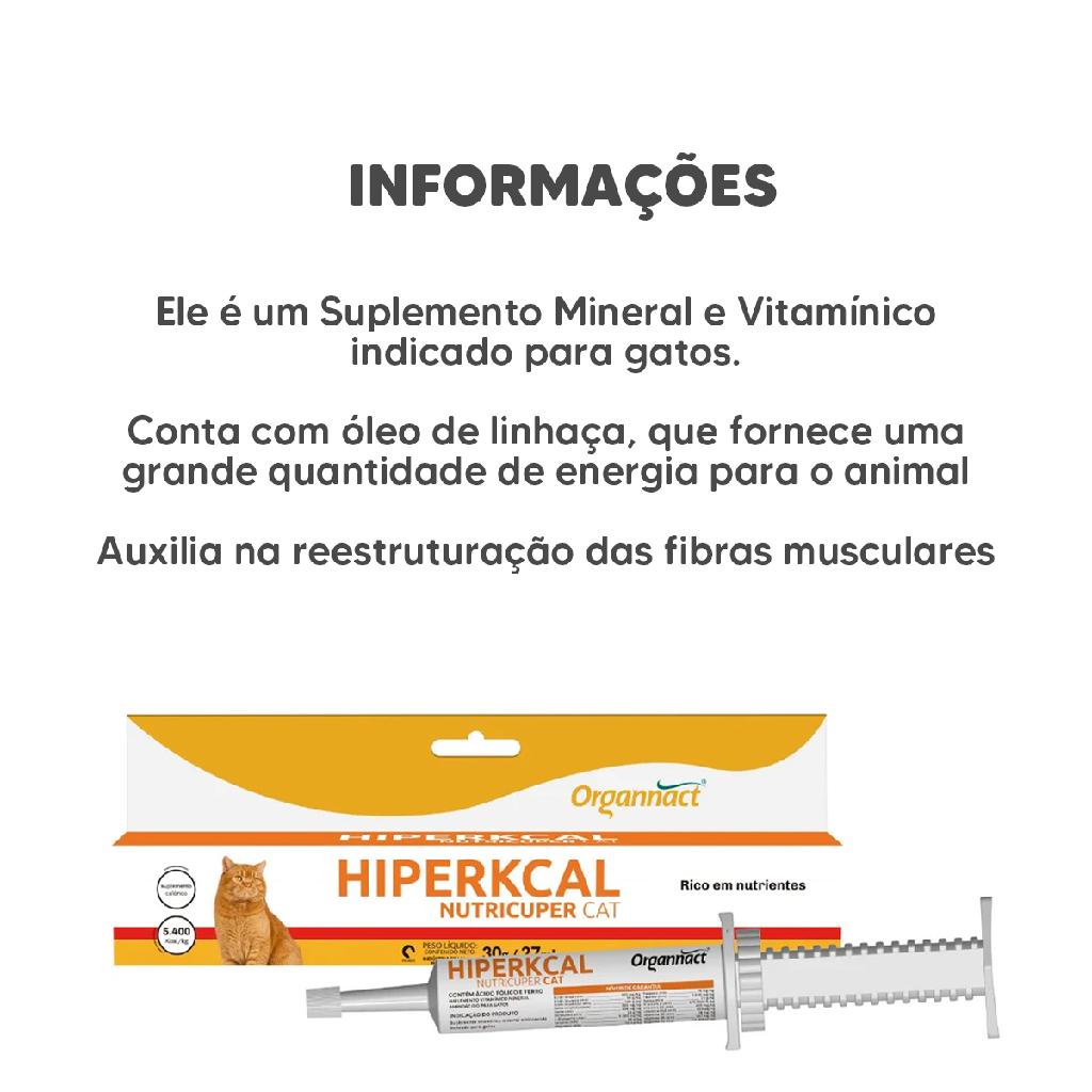 "A LeluPets nasceu de uma paixão e dedicação de aproximadamente 20 anos de experiência nessa área tão incrível. Desde o início de nossa história, já são mais de 100 mil clientes atendidos. Estamos aqui determinados em fazer a diferença, democratizando e simplificando o cuidado com o seu pet para oferecer a melhor experiência para você e seu amiguinho. Mantemos nossas orelhas em pé, atentos às novidades do mundo pet para trazê-las até você. Nós somos apaixonados por pets! O seu pet é também da nossa família! Suplemento Vitamínico Hipercalórico Hiperkcal Nutricuper Cat O Suplemento Vitamínico Hiperkcal Nutricuper Cat, produzido pela Organnact, é um suplemento hipercalórico energético para gatos. Nossos amiguinhos peludos podem não produzir a quantidade de determinadas substâncias para o adequado funcionamento do organismo e, devido à falta de certas vitaminas, os gatinhos podem desenvolver algumas complicações. Este é um produto que irá auxiliar nessa manutenção! - Indicado para gatos - Rico em nutrientes - Com óleo de linhaça, que fornece energia - Contém ácidos graxos essenciais - Alto aporte energético - Reposição de diversas vitaminas - Fácil aplicação - Auxilia na reestruturação das fibras musculares - Embalagem de 30g. *Consulte sempre o Médico Veterinário de sua confiança para o uso apropriado deste produto. Leia a bula ou informações descritas na embalagem. "