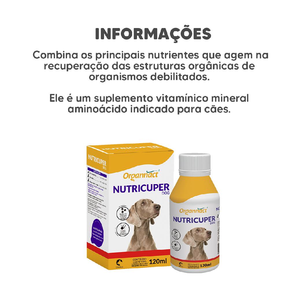 "A LeluPets nasceu de uma paixo e dedicao de aproximadamente 20 anos de experincia nessa rea to incrvel. Desde o incio de nossa histria, j so mais de 100 mil clientes atendidos. Estamos aqui determinados em fazer a diferena, democratizando e simplificando o cuidado com o seu pet para oferecer a melhor experincia para voc e seu amiguinho. Mantemos nossas orelhas em p, atentos s novidades do mundo pet para traz-las at voc. Ns somos apaixonados por pets! O seu pet tambm da nossa famlia! Suplemento Hipercalrico para Cachorro Nutricuper Dog 120ml O Suplemento Hipercalrico Nutricuper Dog 120 ml, feito pela Organnact, combina os principais nutrientes que agem na recuperao das estruturas orgnicas de organismos debilitados. Ele um suplemento vitamnico mineral aminocido indicado para ces que ficaram sem alimento por mais de trs dias, utilizando principalmente gordura endgena como energia. - Indicado para ces - Suplemento hipercalrico - Acompanha seringa dosadora - Fornece energia e cidos graxos essenciais - Contm cidos graxos poli-insaturados, megas 3 e 6 - Vitamina C responsvel em remover e inativar os radicais livres - Embalagem de 100ml. *Consulte sempre o Mdico Veterinrio de sua confiana para o uso apropriado deste produto. Leia a bula ou informaes descritas na embalagem. "