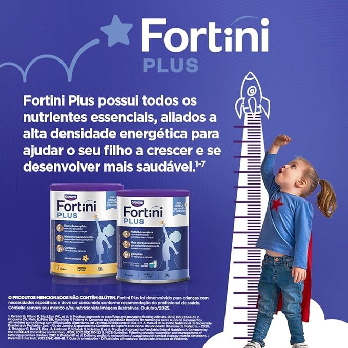Fortini Plus Sem Sabor 400g: Mais energia e nutrientes para seu filho crescer mais forte!1-6 Fortini Plus Sem Sabor 400g é um suplemento infantil com alta densidade energética. Possui nutrientes que contribuem para a recuperação nutricional de crianças de 3 a 10 anos que têm dificuldade em manter ou ganhar peso. Um plus de energia e nutrientes para ajudar na rápida recuperação nutricional!1-8,10,11 Este produto contém 29 vitaminas e minerais, oferece mais energia em menor volume e nutrientes aliados que podem ajudar na rápida recuperação nutricional.1-3,5,10,14 Disponível nas versões sabor baunilha e sem sabor, Fortini Plus pode ser usado com alimentos doces ou salgados e em receitas como molhos, purês, iogurtes, sucos, entre outros. O PRODUTO MENCIONADO NÃO CONTÉM GLÚTEN. Consulte sempre seu médico e/ou nutricionista. Fortini Plus foi desenvolvido para crianças com necessidades específicas e deve ser consumido conforme a recomendação de um profissional de saúde. Características: - Mais energia em menor volume2,14: suplemento infantil hipercalórico. - Energia e nutrientes: contribuem para crescimento e desenvolvimento1-6. - Versão sem sabor: versátil, pode ser utilizada em receitas doces e salgadas. - Isento de lactose. Ingredientes Maltodextrina, óleos vegetais (palma, girassol alto oleico, canola), caseinato, sacarose, citrato tripotássico, fosfato de potássio dibásico, fosfato de magnésio, cloreto de sódio, carbonato de cálcio, cloreto de colina, ácido L-ascórbico, L-ascorbato de sódio, taurina, sulfato ferroso, sulfato de zinco, L-carnitina, nicotinamida, sulfato de manganês (II), D-pantotenato de cálcio, tiamina mononitrato, sulfato de cobre, riboflavina, cloridrato de piridoxina, fluoreto de sódio, palmitato de retinila, acetato de DL-alfa-tocoferila, DL-alfa-tocoferol, colecalciferol, ácido N- pteroil-L-glutâmico, iodeto de potássio, cloreto de cromo (III), molibdato de sódio, selenito de sódio, D-biotina, fitomenadiona, cianocobalamina e emulsificante lecitina de soja. NÃO CONTÉM GLÚTEN. ALÉRGICOS: CONTÉM DERIVADOS DE LEITE E DE SOJA. PODE CONTER PEIXE.Fortini Plus foi desenvolvido para crianças com necessidades específicas e deve ser consumido conforme a recomendação de um profissional de saúde. Novembro/2024. Para mais informações e consulta de referências, visite www.fortinibrasil.com.br.1. SBP, 2020. 2. Braegger C et al., 2010. 3. Mehta NM et al., 2013. 4. ILSI, 2019. 5. ABRAN, 2018. 6. SBP, 2022. 7. ASPEN, 2002. 8. Giugliani ER, 2000. 9. Nogueira CA et al., 2018. 10. NICE, 2017. 11. Kerzner, 2015. 12. Comparativo de produtos de mesma categoria realizado em 11/2024. 13. SBP, 2018. 14. Comparado com fórmula pediátrica com 1 kcal/mL.