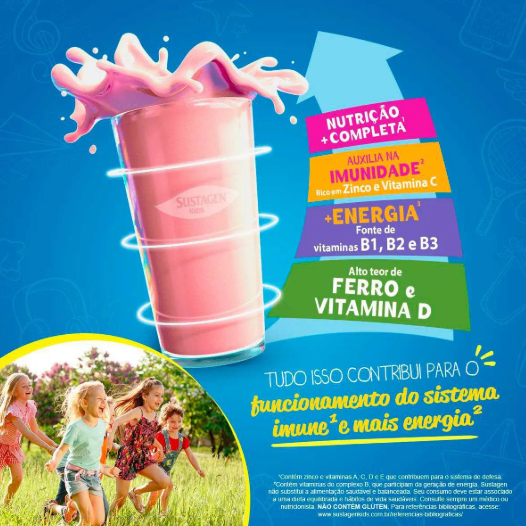 Sustagen Kids é um complemento alimentar indicado para que mamães e papais possam proporcionar uma nutrição mais completa para as crianças. Ele contém um sabor agradável e é composto por 26 vitaminas e minerais, incluindo Zinco e Vitaminas A, C, D e E (que contribuem para o sistema de defesa da criança), e Vitaminas do complexo B (que participam da geração de energia). Este produto não substitui a alimentação saudável e balanceada. Seu consumo deve estar associado a uma dieta equilibrada e hábitos de vida saudáveis. PRODUTO COM VALIDADE PARA 05/2026 COM SUPER DESCONTO! IDEAL PARA USO IMEDIATO. APROVEITE ENQUANTO DURAR O ESTOQUE!