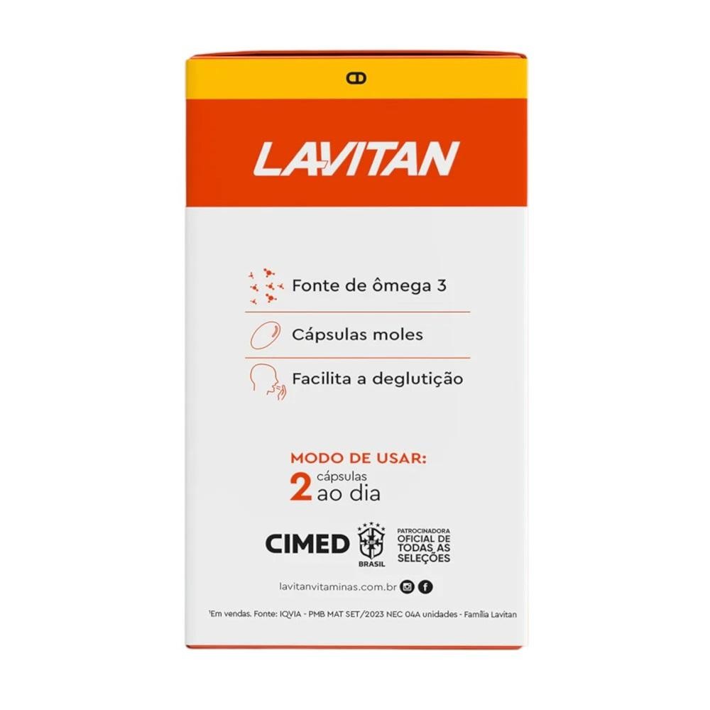 O Lavitan Ômega 3 é um suplemento alimentar em forma de cápsulas gelatinosas. Ele é feito com óleo de peixe e por isso é rico em EPA e DHA, ácidos graxos que formam o ômega 3. Ele não contém glúten e lactose, e por isso pode ser ingerido por pessoas alérgicas ou intolerantes a essas substâncias. Modo de Uso: Uso oral. Uso adulto acima de 19 anos. Ingerir 2 cápsulas ao dia. Não exceder a recomendação diária de consumo indicada na embalagem. Este produto não é um medicamento. ALÉRGICOS: Contém derivados de peixe e pode conter amendoim e soja. Não contém glúten. Não contém lactose.