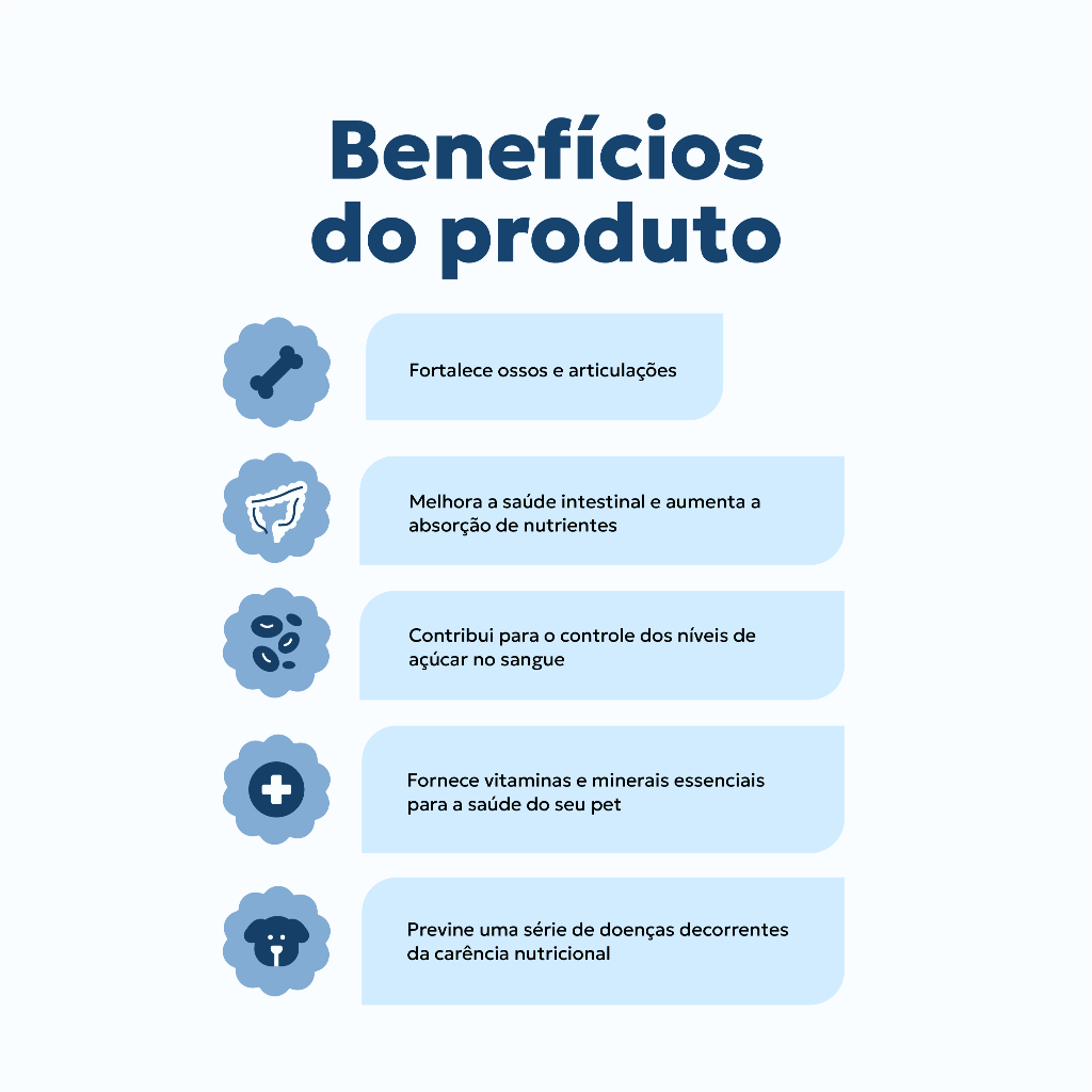 Nutroplus Manutenção Suplemento para quem quer oferecer uma alimentação caseira de forma segura, nutritiva e equilibrada para cães. Oferecer dieta caseira é um ato de amor, mas também exige cuidado para que nenhum nutriente essencial falte no prato do seu pet. Pensando nisso, a Nutroplus desenvolveu o Manutenção, um suplemento vitamínico e mineral, formulado com tecnologia avançada e ingredientes de alta biodisponibilidade. Por que o Nutroplus Manutenção é indispensável na dieta caseira? Fórmula moderna e completa Desenvolvido em conformidade com o Nutrient Requirements of Dogs and Cats - NRC (2006) para suprir as necessidades de nutrientes essenciais de cães. Nutrientes com alta absorção Contém minerais quelatados e vitaminas que garantem melhor aproveitamento pelo organismo, com resultados visíveis. Mais saúde intestinal e imunidade fortalecida A combinação de prebióticos (GOS, FOS, MOS) e betaglucanos melhora a microbiota, fortalece a imunidade e contribui para fezes mais firmes e com menos odor. Controle glicêmico e lipídico Auxilia na redução da glicemia e colesterol, promovendo equilíbrio metabólico. Alta palatabilidade Contém extrato de leveduras, trazendo mais sabor e aceitação, até para pets seletivos. Benefícios que você nota no dia a dia Mais disposição e vitalidade Imunidade fortalecida Melhor aproveitamento das refeições Redução de riscos nutricionais em dietas caseiras Auxilia na redução da glicemia e do colesterol Para quem é indicado? Para cães adultos, de todas as raças e portes, que fazem dietas caseiras. Composição: Ácido Fólico, Ácido Pantotênico, Betaglucanos, Biotina, Cálcio, Cobre Mineral Quelato, Colina, Ferro Mineral Quelato, FOS, Fósforo, Glucanos, GOS, Iodo, Magnésio Mineral, Manganês Mineral Quelato, MOS, Niacina, Selênio Orgânico, Vitamina A, Vitamina B1, Vitamina B12, Vitamina B2, Vitamina B6, Vitamina C, Vitamina D, Vitamina E, Vitamina K3, Zinco Mineral Quelato. Como usar o suplemento Adicione 6g do produto para cada 1.000 kcal de dieta (equivale a aproximadamente 1kg de alimento). Acrescente o conteúdo na alimentação e misture bem, de preferência na hora de servir. Introduza o produto de forma gradativa: adicione 25% da dose indicada a cada 4 dias até alcançar a dose total. Contém colher dosadora de 2,5g. Segurança e qualidade A linha Nutroplus Manutenção foi desenvolvida com: Microminerais quelatados Prebióticos GOS, FOS, MOS Betaglucanos (1/3 e 1/6) Matérias-primas de alta pureza Tudo para garantir nutrição e proteção para o seu pet.