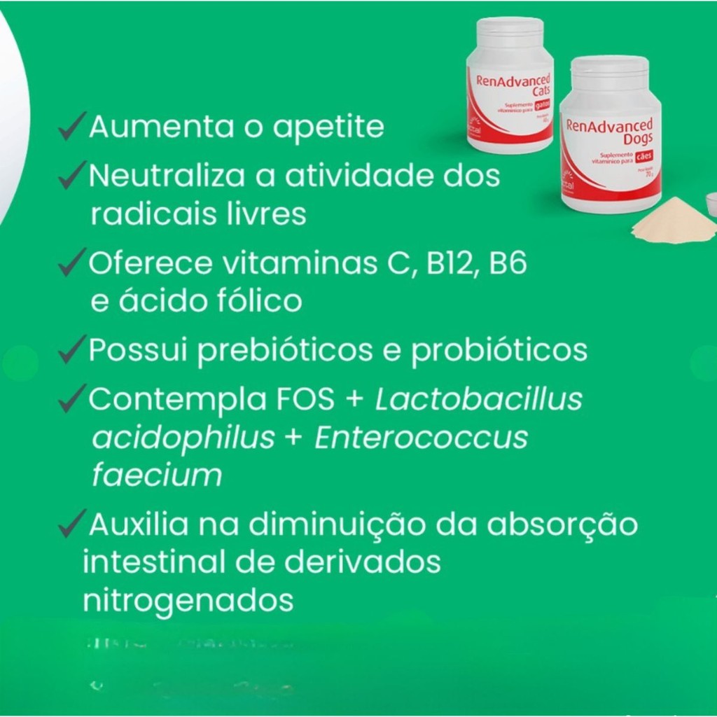 A MANADA ANIMAL é um marketplace de produtos veterinários. É a escolha certa para tutores que prezam pela qualidade dos produtos que seu animal necessita. Tudo com o suporte de uma equipe de veterinários e gestores com mais de 10 anos de experiência no mercado. Fique tranquilo, todos os nossos produtos são originais, adquiridos através de distribuidores credenciados! Ah, e todas as vendas acompanham nota fiscal! MANADA ANIMAL, Tranquilidade pra você, cuidado para ele! _______________________________________ RenAdvanced Cats Prébióticos + Probióticos + Bioflavonóides + Complexo de Vitaminas - FOS + Lactobacillus acidophilus + Enterococcus faecium • Prébióticos e probióticos • Auxiliam na diminuição da absorção intestinal de derivados nitrogenados • Aumentam o apetite - Bioflavonóides (extrato seco de laranja padronizado a 40% de hesperidina) - Vitamina C • Neutralização da atividade dos radicais livres - Vitamina B12, Ácido Fólico, Piridoxina • Vitaminas hidrossolúveis Modo de Uso: Adicione diariamente o suplemento nutricional RENADVANCED CATS ou RENADVANCED DOGS no alimento de seu gato ou cão de acordo com a tabela ao lado. É possível dividir a dosagem diária de em 2 a 3 administrações, de acordo com o número de refeições fornecidas ao animal. Administre RENADVANCED CATS ou RENADVANCED DOGS por 30 dias ou períodos mais longos. É preferível misturar o produto com alimento úmido. No caso de uma dieta baseada somente em alimentos secos: umidifique levemente o alimento para assegurar uma boa adesão do pó ao alimento e a ingestão da dose diária de RENADVANCED CATS ou RENADVANCED DOGS por completo.