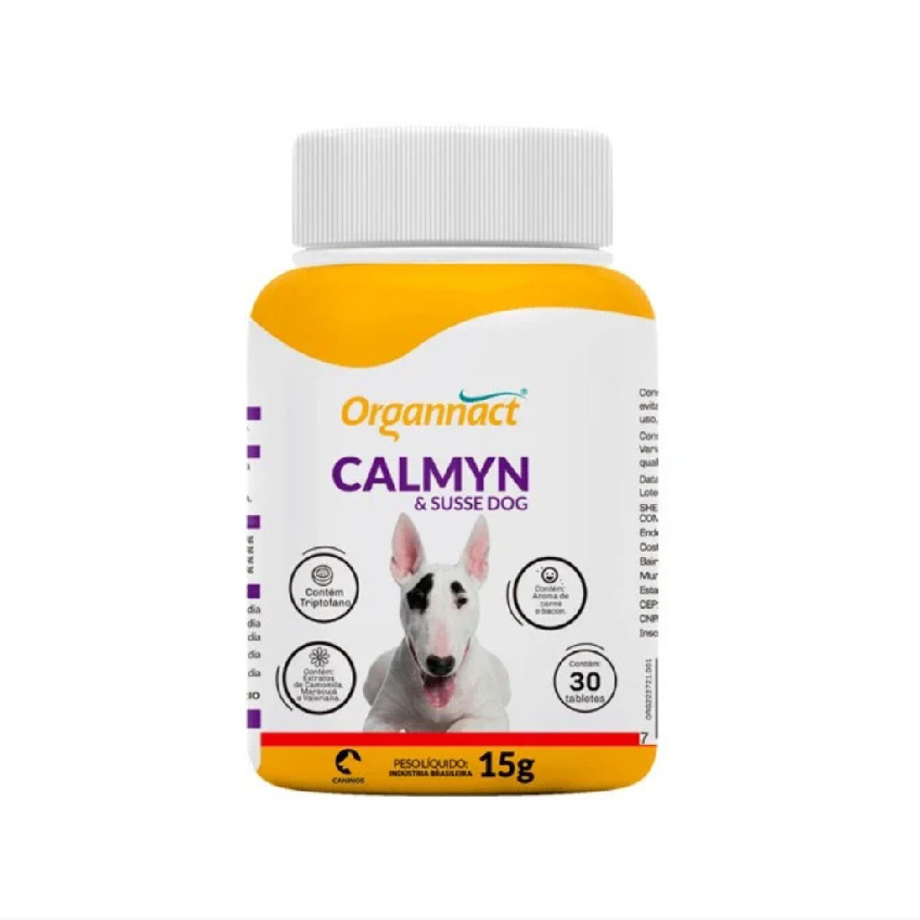 Suplemento Vitamínico Calmyn & Susse 15g Para Cães OrgannactDescrição: O Suplemento Vitamínico Calmyn & Susse 15g Para Cães Organnact é um produto desenvolvido especialmente para promover o bem-estar emocional e reduzir o estresse de cães que enfrentam situações de ansiedade, medo ou agitação. Com uma fórmula inovadora e equilibrada, esse suplemento combina nutrientes essenciais com compostos naturais que auxiliam na tranquilidade e relaxamento do seu pet, sem causar efeitos sedativos fortes, oferecendo uma solução mais natural e eficaz para a saúde emocional do seu amigo de quatro patas. Benefícios principais: Reduz o estresse e a ansiedade: O Calmyn & Susse contém componentes que ajudam a diminuir comportamentos indesejados causados por estresse, como latidos excessivos, agitação ou medo em situações de viagens, visitas ao veterinário ou fogos de artifício.Fórmula natural e equilibrada: Com ingredientes naturais, como camomila e passiflora, que possuem propriedades calmantes, o suplemento auxilia o seu cão a manter a calma em situações estressantes, sem a necessidade de sedação intensa.Melhora o bem-estar emocional: Contribui para a saúde emocional do seu pet, proporcionando uma sensação de relaxamento e conforto, ajudando a equilibrar o comportamento do animal de maneira suave.Prático e saboroso: O suplemento vem em tabletes mastigáveis, que são saborosos e fáceis de administrar, garantindo que seu cão aceite bem o tratamento diário.Indicado para situações específicas de estresse: Ideal para cães que ficam agitados com a presença de fogos de artifício, viagens, mudanças de ambiente, visitas ao veterinário ou qualquer outra situação que gere ansiedade.Composição: O suplemento é formulado com vitaminas, minerais e extratos naturais calmantes, como camomila, passiflora e magnésio, que trabalham em conjunto para promover o equilíbrio emocional do seu cão. Não contém substâncias sedativas pesadas, apenas ingredientes suaves que auxiliam no controle do estresse. Modo de uso: Administre a quantidade recomendada de tabletes por dia, conforme o peso e a necessidade do seu cão. O suplemento pode ser dado diretamente na boca do pet ou misturado com a alimentação. Sempre siga as orientações do veterinário para garantir a dosagem adequada para o seu animal. Indicação: Ideal para cães que sofrem de ansiedade, estresse, medo de sons fortes, viagens ou qualquer outro fator que provoque nervosismo. Pode ser utilizado em cães de todas as idades e portes, sempre com orientação profissional. Embalagem: 15g (aproximadamente 15 tabletes mastigáveis).