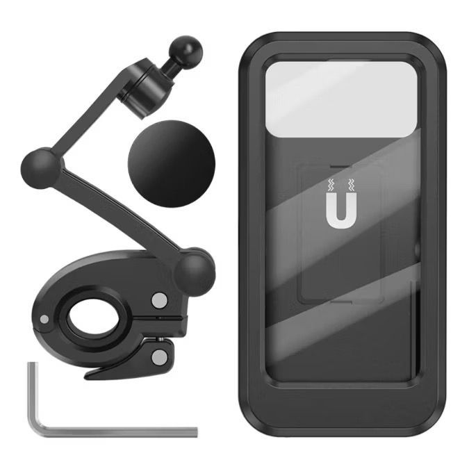 Suporte impermeável para celular em moto. Fixação magnética do celular para maior segurança. Montagem do suporte no guidão da moto. Suporte com fixação por clipe e fixação magnética do celular para maior segurança. Montagem do suporte por encaixe, facilitando a instalação. - À Prova D'água com dupla camada de vedação - Fixação rígida e 100% segura no guidão da moto ou bicicleta - Visor de acrílico nítido, não atrapalha a visualização e nem o toque na tela - Articulado com rotação 360 graus