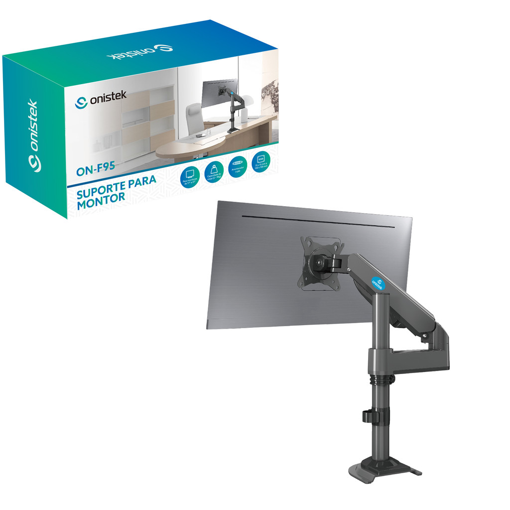 O Suporte para Monitor com Pistão a Gás e Juntas Articuladas é a solução perfeita para quem busca flexibilidade e praticidade ao montar o seu setup de trabalho ou entretenimento. Com capacidade para suportar monitores de 17" a 27" e uma carga de até 9kg, ele garante estabilidade e segurança para a sua tela, além de proporcionar total liberdade de movimento, ajustando a posição do monitor com facilidade. CARACTERÍSTICAS: Compatível com monitores de 17” a 27” Suporte com pistão a gás e juntas articuladas para fácil ajuste de posição Padrão VESA (75x75 mm a 100x100 mm) Capacidade de carga: até 9kg Permite instalação na borda da mesa ou sobre o tampo com perfuração Fabricado em liga de alumínio fundido super-resistente ESPECIFICAÇÕES: Modelo: ON-F95 Suporte para monitores de 17” a 27” Material: Liga de alumínio fundido Padrão VESA: 75x75 mm a 100x100 mm CONTEÚDO: 01 Suporte para Monitor com Pistão a Gás e Juntas Articuladas Kit de fixação e manual de instalação