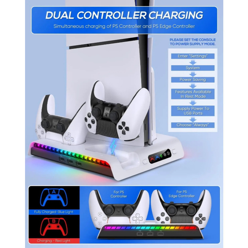 Transforme seu setup gamer com o Suporte Vertical Multifuncional 4 em 1, projetado especialmente para o NOVO PS5 Slim. Com design moderno e compacto, ele combina carregamento eficiente, resfriamento avançado, luzes RGB personalizáveis e organização completa. Estação de Carregamento Dupla - Carregue simultaneamente 2 controles PS5 (Original ou Edge) em 2,5 a 4 horas. - Luzes indicadoras facilitam o acompanhamento do status de carregamento. - Compatível com fonte de alimentação 5V/3A ou diretamente conectado ao console PS5 Slim. Sistema de Resfriamento Eficiente - Equipado com ventilador turbo de baixo ruído com 3 níveis ajustáveis para manter o console PS5 Slim refrigerado, mesmo em sessões de jogos intensas. Iluminação RGB Personalizável - Escolha entre 9 modos de luz RGB para combinar com o ambiente e suas cenas de jogo. - Pressione o botão por 2 segundos para desligar e manter o último modo configurado. Organização e Conectividade - Três portas USB para transferência de dados e carregamento de acessórios, como headsets, mouses e outros dispositivos. - Gancho integrado para armazenar fones de ouvido, economizando espaço e deixando tudo organizado. Design Compacto e Elegante - Construído com base de metal resistente para maior estabilidade. - Design pensado para manter seu console, controles e acessórios no lugar com segurança. Observações Importantes: - Compatível apenas com PS5 Slim (Digital e Disc Edition - 2023). - Não compatível com a versão antiga do PS5 (modelo padrão). Conteúdo: 1x Suporte Vertical Multifuncional PS5 Slim 1x Cabo Tipo-C 1x Manual de Instruções