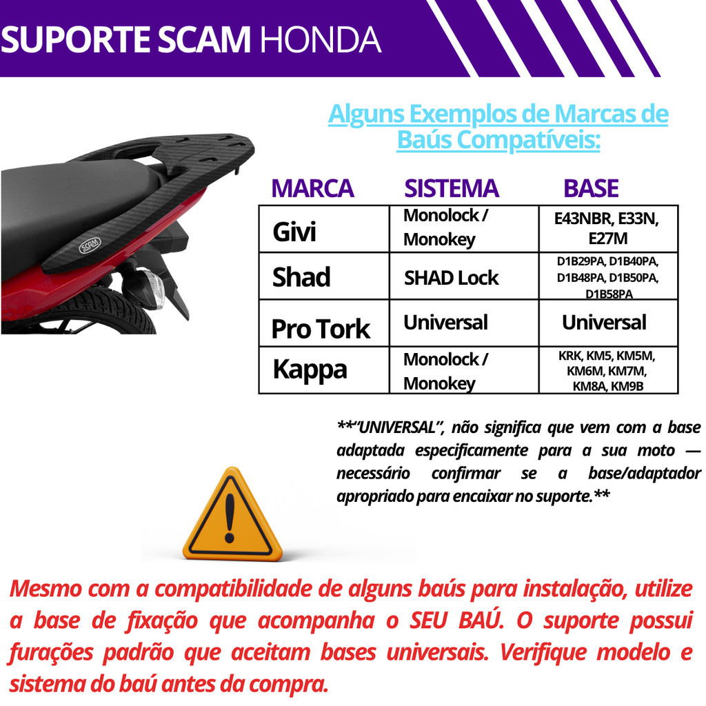 BAGAGEIRO / SUPORTE DO BAÚ SUPERIOR SCAM POLIMERO DE ENGENHARIA REFORÇADO COM FIBER FORCE MOTOS COMPATÍVEIS Honda CG125/150/160 2014 a 2024 (exceto CG160 Titan) Inclui: Suporte de baú superior SCAM + Parafusos necessários + Manual de montagem. DESIGN DA PEÇA INTEGRADO ÀS LINHAS DA MOTO Instalação fácil e rápida!!! NÃO ENFERRUJA!!! Fixação: Substitui as alças originais. Parafusado no chassi da moto com 4 que acompanham o produto. NÃO É NECESSÁRIO NENHUMA ALTERAÇÃO OU FURO NA MOTO. Baús superiores recomendados: Compatível com todos os baús das melhores marcas do mercado – Sistemas Monolock ou Monokey (dependendo da base original do baú) Especificação do material: POLÍMERO DE ENGENHARIA REFORÇADO COM FIBRA. Acabamento: Texturização de Fibra de Carbono. Capacidade: 8 kg. OBS: ****NÃO ACOMPANHA BAÚ***