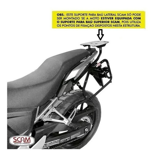 Anuncio referente ao Suporte para Baus Laterais. Código: Spto102 Aplicação: - Honda CB 500x (Todos os modelos) - Honda NX 500 (2026 em diante) ---------------------------------------- ***ATENÇÃO: Este suporte lateral só pode ser instalado juntamente com o suporte superior/traseiro da mesma marca SCAM, pois utiliza pontos de fixação dispostos nesta peça. ---------------------------------------- Especificação: - Fabricante: Scam - Chapas aço Carbono 5 mm de espessura; - Tratamento de superfície contra corrosão; - Pintura epóxi. - Cor: Preto *Baús Laterais Recomendados: E21, E22, E360, E41, E52, E55, V46, V47, TRK33, TRK46, TRK52. =================================== COMPRE COM TRANQUILIDADE Empresa séria e correta Com loja física e há mais de 9 anos com vendas on-line Postagem rápida com o melhor pós-venda Garantia de todos os produtos Ótima reputação e clientes satisfeitos ---------------------------------------- Atenção!!! Antes de clicar em comprar, favor tirar todas as suas duvidas no campo de perguntas ao vendedor.