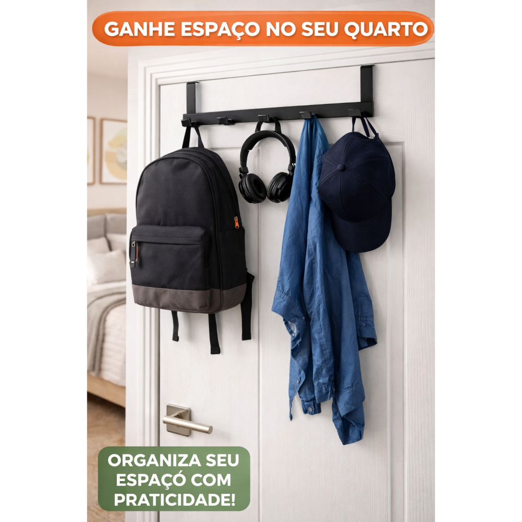 CABIDE DE PORTA COM 6 GANCHOS – SUPORTE MULTIUSO EM METAL O cabide de porta com 6 ganchos é a solução ideal para organizar roupas, bolsas, toalhas e acessórios de uso diário de forma prática e funcional. Desenvolvido para encaixe direto na porta, dispensa o uso de ferramentas, furos ou parafusos, garantindo instalação rápida e segura. Fabricado em metal de alta qualidade, possui pintura resistente que protege contra ferrugem e corrosão, oferecendo maior durabilidade mesmo em ambientes úmidos como banheiros e lavanderias. Seu design versátil permite o uso em diversos ambientes, como quartos, closets, banheiros, cozinhas e áreas de serviço. Principais vantagens: 6 ganchos resistentes para múltiplos itens Instalação simples, sem necessidade de ferramentas Estrutura metálica reforçada Revestimento com tinta anticorrosiva Uso multiuso para qualquer porta compatível Ideal para organização e otimização de espaço Especificações técnicas: Material: Metal Cor: Branco Dimensões do produto: 6,3 x 7,5 x 29 cm Tamanho do encaixe da porta: 6 cm Conteúdo da embalagem: 1 Cabide de Porta com 6 Ganchos Produto prático, resistente e funcional, ideal para quem busca organização com eficiência e design discreto.