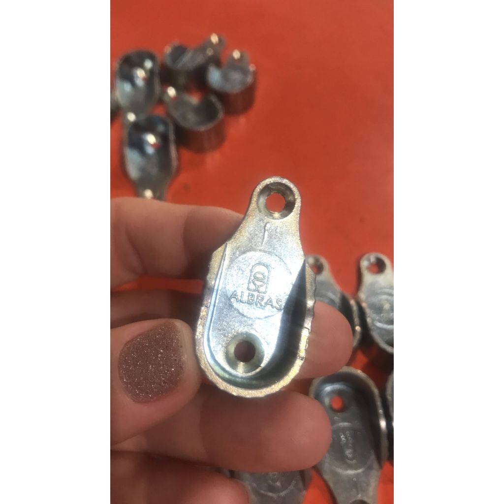 Suporte cabideiro zincado zamac Suporte para cabideiro em zamac. Alta capacidade de carga. Acabamento perfeito com cabideiros em alumínio. Características: Altura: 4.5cm Largura: 22,5mm Profundidade: 1,3cm Medida entre os furos: 3,2cm Medida Furo: 3,2mm Matéria Prima: Zamac