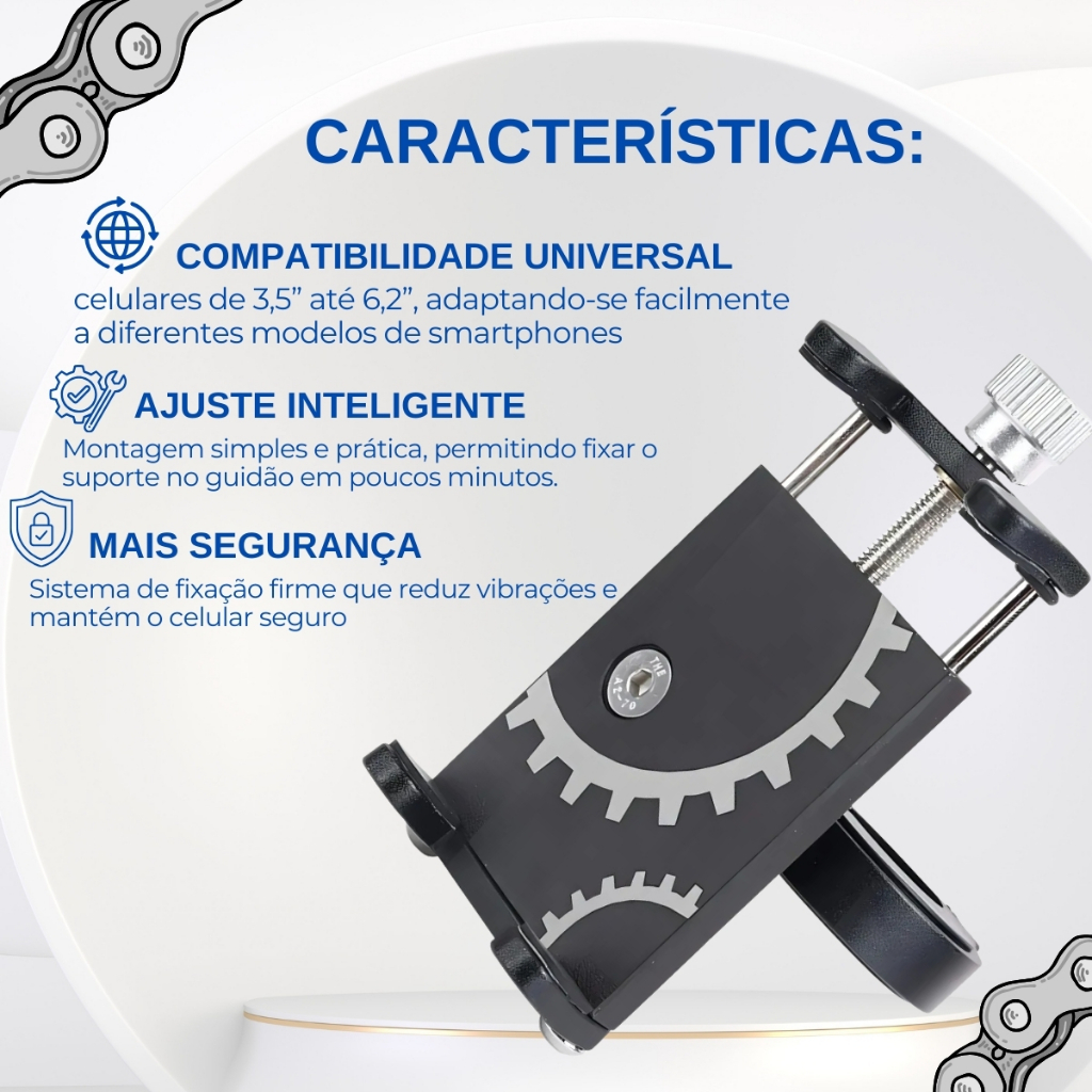 NUNCA MAIS SOFRA COM CELULARES CAINDO DO GUIDÃO! Conheça o Suporte de Celular em Liga de Alumínio, a escolha número 1 de ciclistas e motoboys que precisam de segurança extrema. Esqueça os suportes de plástico que quebram ou afrouxam com a trepidação! FICHA TÉCNICA: Material: 100% Liga de Alumínio (Não enferruja, não resseca) Compatibilidade de Telas: Celulares de 3,5" a 6,2" (Ajuste de 55mm até 100mm de largura) Compatibilidade de Guidão: Tubos de 21mm a 31,8mm Peso: Super leve (Apenas 90g-100g) Mecanismo: Trava mecânica ajustável por parafuso lateral Cor: Preto com grafismos a laser O QUE VOCÊ VAI RECEBER? 1x Suporte de Celular Alumínio Premium DÚVIDAS FREQUENTES: - Serve para Moto e Bicicleta? Sim! O ajuste da abraçadeira o torna compatível com a maioria dos guidões. - Ele arranha o aparelho? Não, as garras em L seguram firmemente a lateral sem danificar o aparelho. - A trava cede com trepidação? De forma alguma. O travamento por parafuso metálico impede que o celular escorregue, mesmo em ruas esburacadas. Estoque Limitado! Garanta já o seu clicando em COMPRAR AGORA!