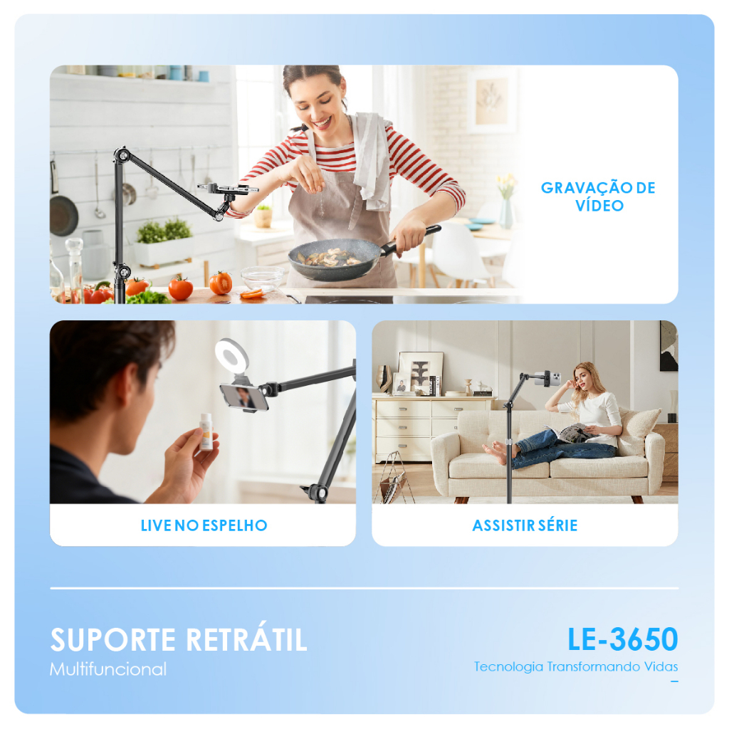 Suporte Celular com Ring Light Altura Regulável Base Antiderrapante Clip Extensível Estável