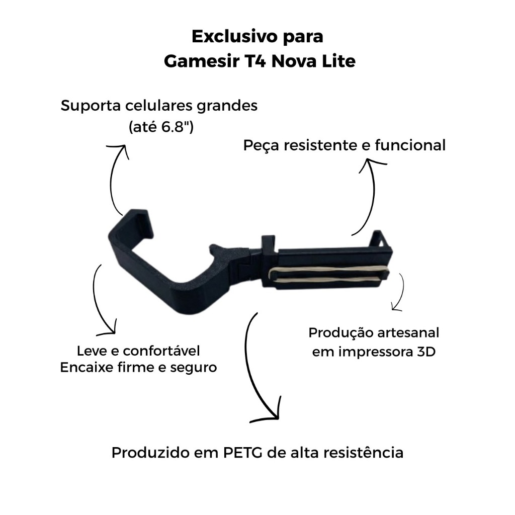 Suporte para Celular GameSir T4 Nova Lite - Para um Jogo Ainda Mais Imersivo! ⚠️ Atenção: O suporte é vendido separadamente. Não acompanha controle nem celular. Eleve sua jogabilidade a outro nível com o Suporte para Celular GameSir T4 Nova Lite, feito para garantir total compatibilidade e melhorar sua experiência em jogos móveis. Fabricado em PETG de alta qualidade, utilizando tecnologia de impressão 3D, esse suporte é leve, resistente e possui um design que se adapta perfeitamente ao seu controle, proporcionando uma experiência de jogo confortável e estável. ✅ Características Principais: -Compatibilidade Exata com o controle GameSir T4 Nova Lite, garantindo uma fixação firme e segura. -Ajuste Universal: Suporta celulares de até 6.8", proporcionando estabilidade para uma jogabilidade sem interrupções. -Material Premium: Feito de PETG de alta resistência, leve e com acabamento impecável, trazendo durabilidade e profissionalismo. -Fixação Segura. 🔧 Instalação Simples e Rápida A instalação do suporte é fácil e segura. Ele é fixado ao controle por meio de encaixe, garantindo uma conexão firme, sem interferir nos botões nem comprometer a pegada do controle. É a praticidade que todo gamer busca! 🎮 Ideal para: -Gamers que desejam um controle preciso e confortável em jogos mobile. -Streamers e criadores de conteúdo que buscam melhorar sua configuração para transmitir suas partidas. -Qualquer pessoa que queira uma experiência de jogo sem os desconfortos de segurar o celular por muito tempo. ⚠️ Controle e celular não estão incluídos.