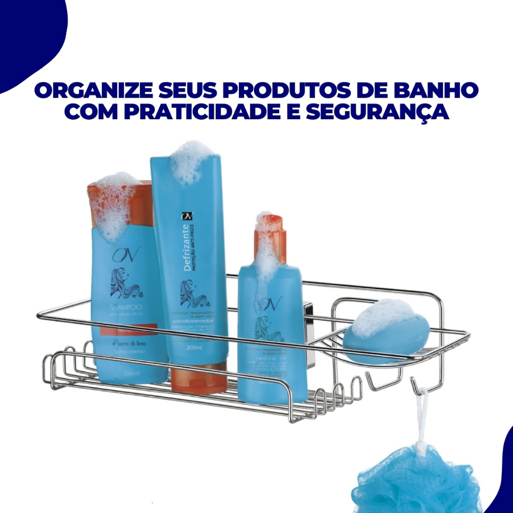 Suporte de Banheiro Cantoneira Porta Shampoo Condicionador Sabonete Saboneteira Aramado Parede com Ventosas Arthi Praticidade que garante uma fixacao com seguranca em superficies planas como azulejos e vidros, atraves do rosqueamento a ventosa exerce uma succao a vacuo, garantindo total seguranca ao produto. Seu banheiro com design inovador e com mais praticidade em guardar seus cosmeticos. Caracteristicas: . Material: Aco cromado . Marca: Arthi .Cor: Cromado . Dimensoes (Altura x Largura x Comprimento): 39 x 10,5 x 39 cm Conteudo da Embalagem: . 01 Suporte Porta Shampoo Sabonete Importante: Garantia de 3 Meses. Valor Unitario. Imagens Meramente Ilustrativas. Nao nos responsabilizamos pelo mau uso do produto