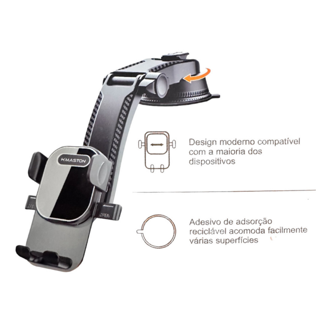 Suporte de Celular para Carro/Veicular H'MASTON CJ71 Este suporte para celular é uma excelente escolha para quem precisa usar o GPS ou atender chamadas enquanto dirige. Com ele, é possível manter o dispositivo sempre visível, sem a necessidade de segurá-lo com as mãos, aumentando a segurança no trânsito. Além disso, sua rotação de 360° permite ajustá-lo em qualquer ângulo para uma melhor visualização da tela. Algumas características importantes deste suporte são: Instalação simples, basta fixá-lo no painel ou no para-brisa do carro; Material resistente e durável, que assegura a segurança do celular enquanto está no suporte; Design moderno e elegante, que combina com qualquer estilo de carro. Com este suporte para celular, você poderá dirigir com mais tranquilidade e praticidade, mantendo suas mãos livres para o volante e evitando multas e acidentes de trânsito.