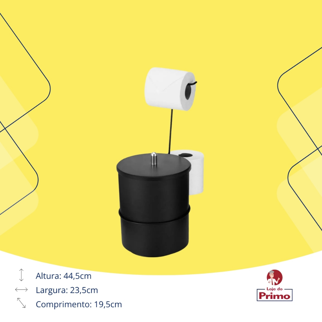Aramado que facilita a retirada do lixo, não escapa ao descartar resíduos, possui cada detalhe muito bem pensado, ele acondiciona o papel além de conter suporte para armazenamento de rolo reserva. * Com lixeira embutida * Produto feito com aço em acabamento poliéster * Suporte para 2 rolos de papel higiênico Especificações do produto: * Altura: 43,5 cm * Largura: 22,5 cm * Comprimento: 18,7 cm * Cor: Preto (Conservação do produto: Lavar com bucha macia e sabão neutro) Loja do Primo Variedades