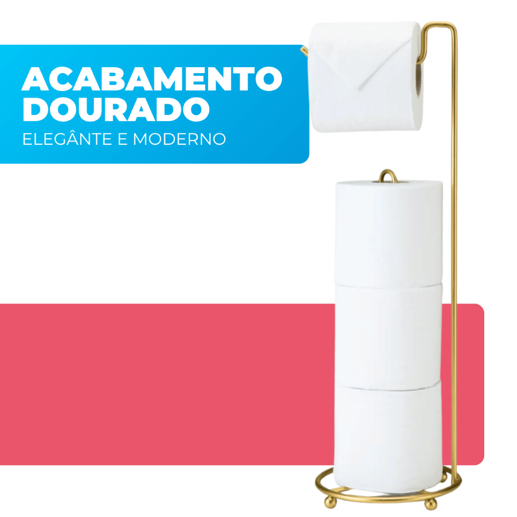 Suporte Chão Porta Papel Higiênico Papeleira 4 Rolos Banheiro Lavabo Dourado Fosco Arthi Seu banheiro muito mais moderno e sofisticado, Otimo acabamento e rico em detalhes. O suporte para papel higienico de chao comporta ate 4 rolos e e perfeito para organizar e deixar seu banheiro muito mais pratico. Sem furos nas paredes. Caracteristicas: . Dimensoes (C x L x A): 15,8 x 14,9 x 47,5 cm . Material: Aco . Design Inovador . Facil Instalacao Dicas de Uso: . Para limpeza periodica recomenda-se o uso de um pano macio, agua e sabao neutro. . Nunca utilize materiais abrasivos, la de aco, esponjas asperas, solventes ou produtos quimicos corrosivos (cloro, agua sanitaria). Conteudo Da Embalagem: . 01 Suporte para Rolo de Papel Toalha Importante: Garantia de 3 Meses. Valor do Unitario. Imagens Meramente Ilustrativas. Nao nos responsabilizamos pelo mau uso do produto.