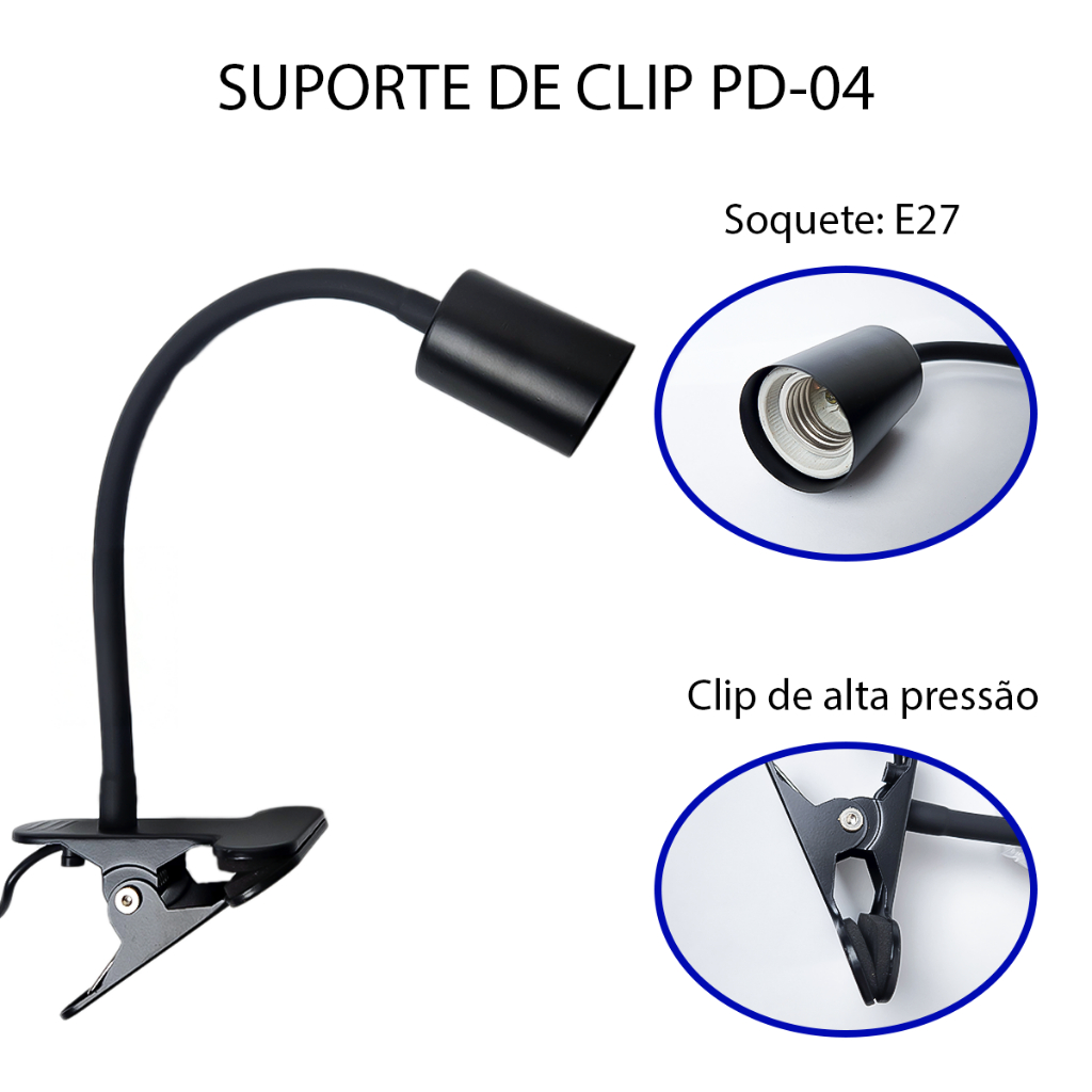 Suporte de Clip PD-04 para Lâmpada Garanta a iluminação ideal para o seu aquário ou terrário com o Suporte de Clip PD-04. Projetado para oferecer praticidade e segurança, esse suporte com presilha resistente é perfeito para posicionar lâmpadas que auxiliam na saúde e no bem-estar de peixes, répteis, anfíbios e plantas. Informações Técnicas: - Cor: Preto - Soquete: E27 (compatível com a maioria das lâmpadas) - Material do soquete: Cerâmica - Voltagem: 110V e 220V - Fixação: Clip metálico com excelente aderência Observações: - Acompanha somente o suporte com clip - Lâmpada não inclusa Prático, versátil e seguro, o suporte PD-04 é a solução ideal para quem busca controle de iluminação em ambientes dedicados à criação ou cultivo de espécies que necessitam de luz específica.