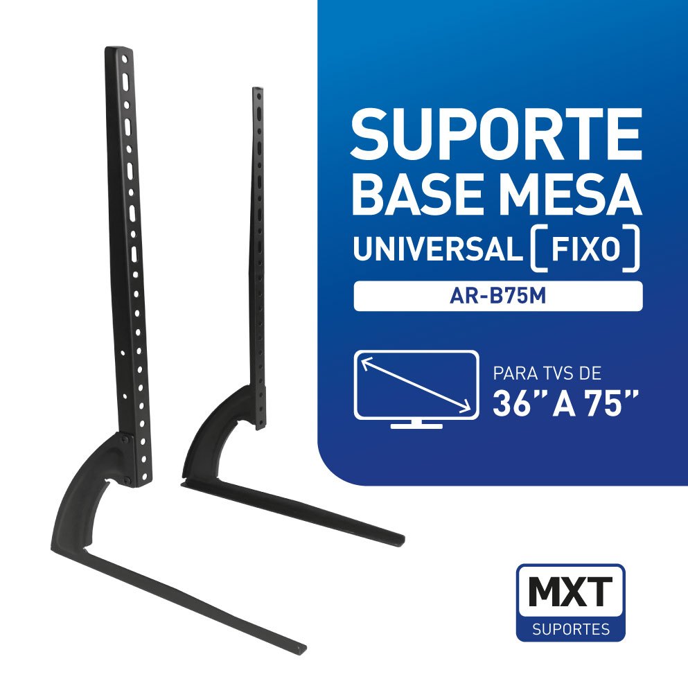 SUPORTE BASE DE MESA PARA TV 36" A 75" - UNIVERSAL SUPORTA ATÉ 50KG FIXO O suporte de mesa universal AR-B75M foi projetado para TVs maiores, de 36 a 75 polegadas, oferecendo uma base segura e estável para seu televisor em superfícies planas. Sua versatilidade é garantida pela ampla compatibilidade com padrões VESA, abrangendo desde 200x100mm até 800x400mm, o que o torna adequado para diversas marcas e modelos de TV LED, LCD e OLED. A construção robusta assegura a firmeza necessária para telas maiores, suportando um peso considerável. A montagem é descomplicada, dispensando a necessidade de furos na parede. Seu design discreto e elegante se adapta a diferentes estilos de decoração. Uma solução prática e eficiente para quem busca uma alternativa ao suporte para suporte que não precisa ser instalado na parede.