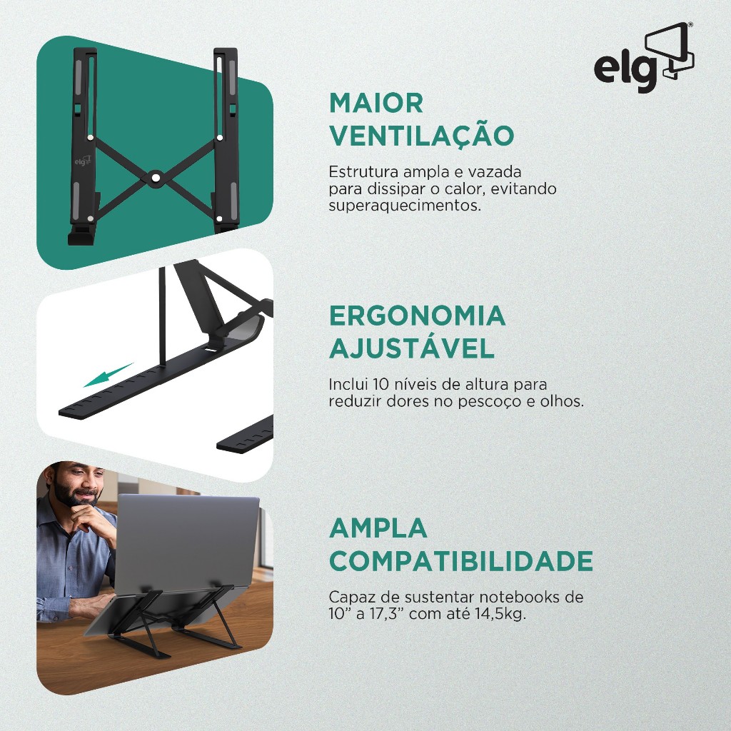Suporte de Mesa Portátil para Notebook 10" a 17,3", 10 Níveis de Altura, Preto, NTB8520B, ELG