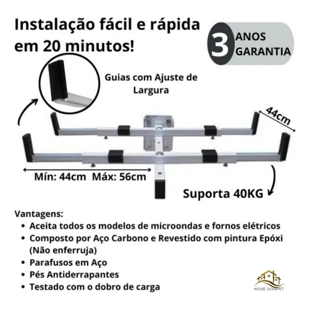 Suporte De Microondas Fixo Na Parede Com Ajuste Forno Elétrico Universal Suporta Até 30kg Organize sua cozinha com praticidade e segurança! Este suporte de parede em aço carbono reforçado com pintura epóxi garante durabilidade, resistência e estabilidade para seu micro-ondas ou forno elétrico. Além de liberar espaço na bancada, possui ajuste de largura e profundidade, se adaptando a diferentes modelos de aparelhos. - Características Técnicas - Material: Aço carbono reforçado com pintura epóxi anticorrosiva - Capacidade de carga: até 45 kg - Profundidade ajustável: de 31 cm até 44 cm - Largura ajustável: de 33 cm até 56 cm - Altura: indeterminada (ajustável conforme a fixação) - Compatibilidade: Universal – micro-ondas e fornos elétricos diversos - Cores: Preto Ou Branco - Instalação: simples e rápida - Acompanha Kit de Instalação Completo: - Parafusos de fixação reforçados - Buchas de alta resistência - Arruelas de proteção - Manual de instruções Perguntas Frequentes (FAQ) 1. Qual peso o suporte aguenta? Até 45 kg com segurança. 2. Serve para qualquer marca e modelo de micro-ondas? Sim, é universal e possui ajuste de largura e profundidade. 3. Acompanha kit de instalação? Sim, inclui parafusos, buchas, arruelas e manual. 4. Posso usar também com forno elétrico? Sim, desde que respeite os limites de peso e medidas. 5. É fácil de instalar? Sim, basta seguir o manual e usar o kit de fixação incluso. Seu micro-ondas seguro, sua bancada livre e sua cozinha muito mais organizada!