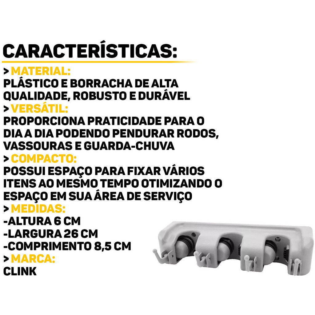 Suporte De Parede Organizador Para Vassoura Rodo Pá Multiuso 3 Encaixes + 4 Ganchos Clink