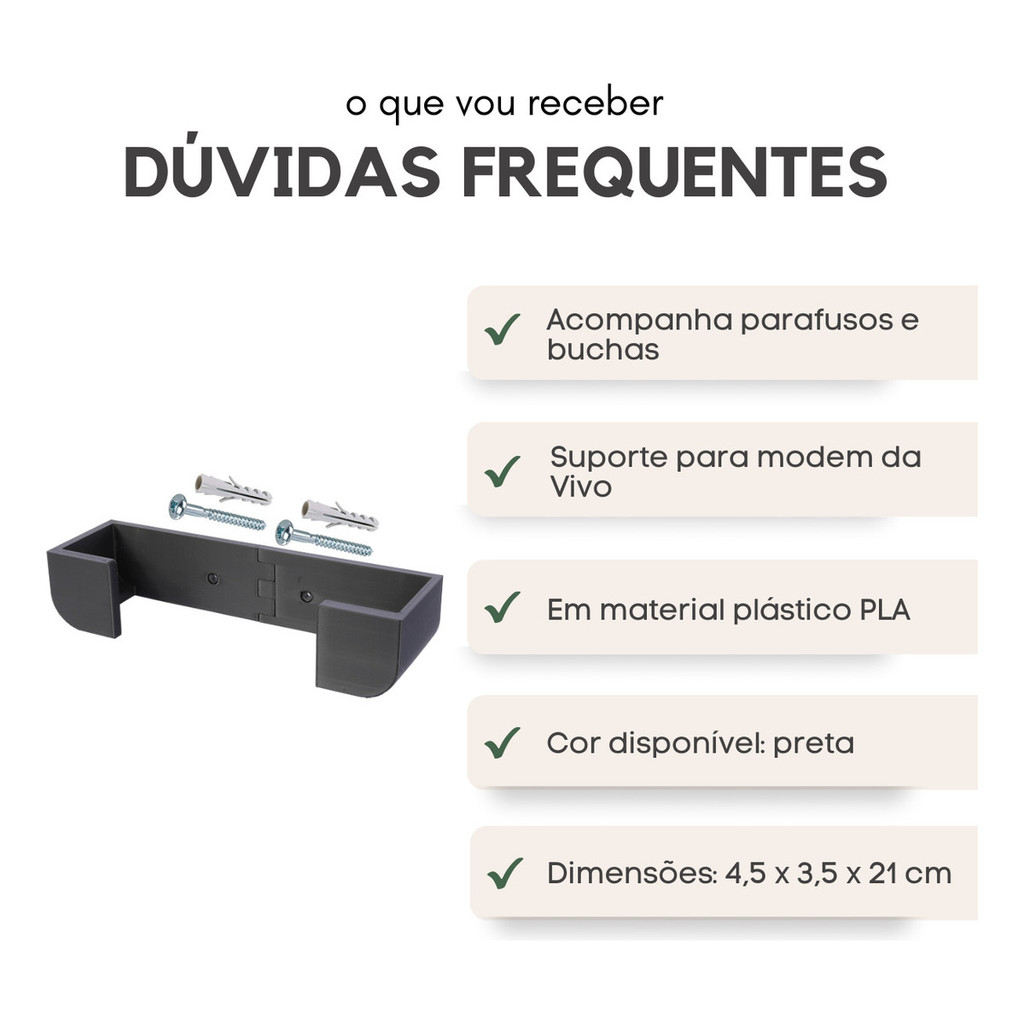 ***** ATENÇÃO!! APROVEITE E TENHA SEU PRODUTO COM O ENVIO MAIS RÁPIDO!! - COLETA: COMPRANDO ATÉ ÀS 15h00 ENVIAMOS NO MESMO DIA!! ***** Suporte de parede para roteador Vivo Fibra. Fabricado em impressão 3D de alta qualidade. Acompanha os parafusos e buchas para fixação e podendo ser fixado na parede ou em móveis. - Compatibilidade: Modem Roteador Wifi Vivo Fibra (Mitrastar 2741 ou 2541) - Especificações: * Material: PLA Premium Plástico * Peso do suporte: 48 gramas * Cor: preto - Itens Inclusos: * 1 suporte para roteador * Parafusos e buchas de fixação