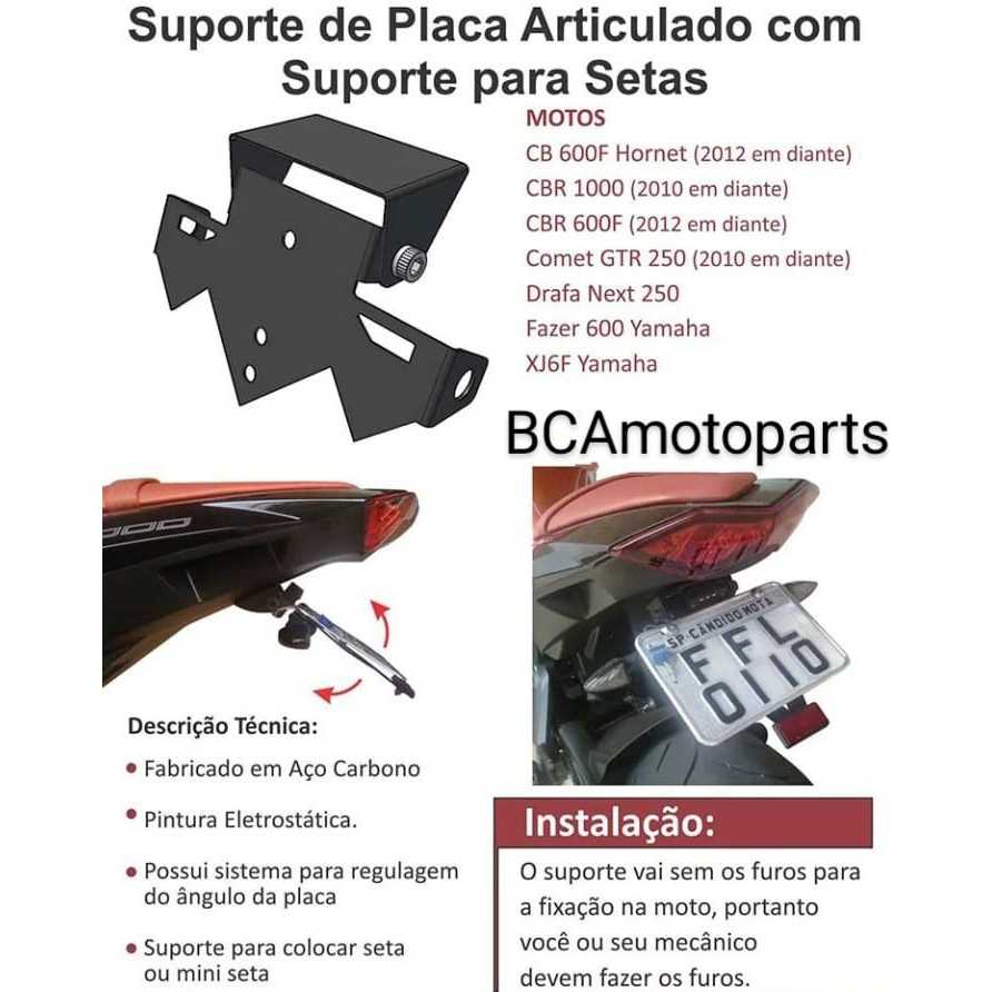 Suporte De Placa Articulado Eliminador Rabeta Universal Moto ATENÇÃO: No anúncio tem as medidas e desenhos para auxiliar na decisão da compra. Como se trata de um produto universal, pode ser que em algumas motos o cliente tenha que ter uma habilidade de mecânica maior para poder instalar o produto, em caso de dúvidas favor perguntar... *TALVEZ PRECISE DE UM AJUSTE E FUROS * por conta do produtos ser universal Itens Inclusos - Suporte de Placa Articulado (para frente e para trás) - Parafuso M8 com aperto de 40 Kg - Pintura Eletrostática - Fabricado em Aço Carbono - Suporte Olho de Gato com Refletivo - Luz de Placa LED instalada no suporte - Para uso das Setas/Piscas Universais ou de LEDs (vc terá que ter as setas esportivas) - Para uso de placa velhas e novas e as placas do Mercosul - Parafusos para instalação Possui todos os itens exigidos por lei. ********ATENÇÃO PRODUTO NECESSITA DE ADAPTAÇÃO POR CONTA DE SER UNIVERSAL********* Instalação Suporte Sem Furos para poder instalar conforme os furos que vc tem já na moto Medidas nas imagens do anúncio