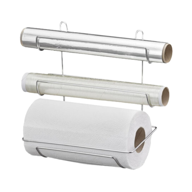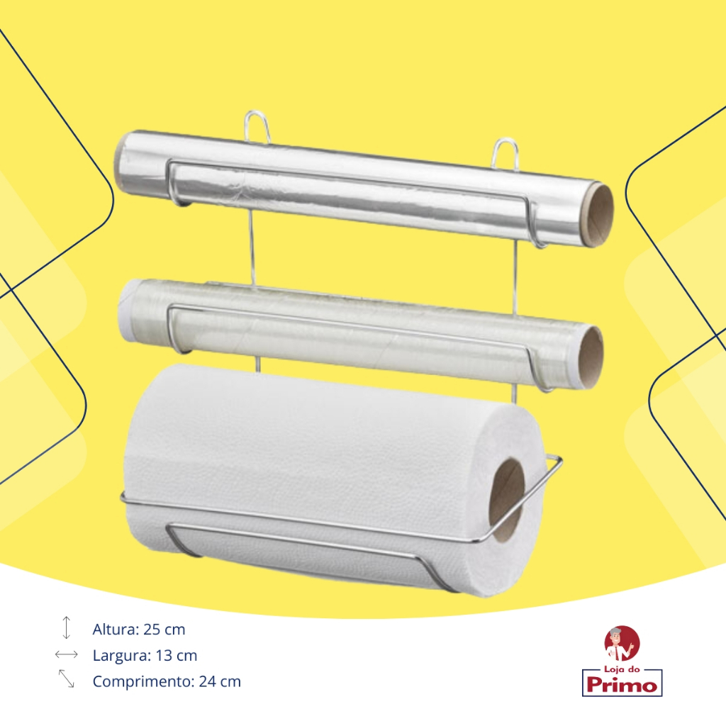 Suporte de Rolos de Papel Triplo para Parede - Cromado - Passerini O Suporte de Rolos de Papel Triplo Passerini é a escolha ideal para trazer organização e praticidade à sua cozinha. Com design inteligente, ele comporta até três rolos de papel, como papel toalha, filme plástico e papel alumínio, garantindo que estejam sempre acessíveis. Sua fixação na parede economiza espaço e seu acabamento cromado adiciona um toque moderno ao ambiente. Destaques e Benefícios Organização Eficiente : Comporta até três rolos de papel, mantendo sua bancada organizada e livre de bagunça. Instalação na Parede : Otimiza o espaço da cozinha, deixando os itens sempre à mão. Acabamento Cromado : Resistência à corrosão e um visual moderno que combina com qualquer estilo de cozinha. Fácil Troca de Rolos : Sistema prático que permite substituir os rolos com facilidade e rapidez. Uso Versátil : Ideal para colocar papel toalha, papel alumínio, filme plástico ou outros tipos de rolos. Especificações Técnicas Material : Metal cromado de alta durabilidade Capacidade : Suporta até 3 rolos Cor : Cromado Fixação : Montagem na parede (inclui parafusos e buchas para instalação) Dimensões Aproximadas : Altura de 38cm, largura de 20cm e profundidade de 12cm Mantenha sua cozinha funcional e estilosa com o Suporte de Rolos de Papel Triplo Cromado da Passerini . Praticidade e elegância em um só produto! Loja do Primo Variedades.